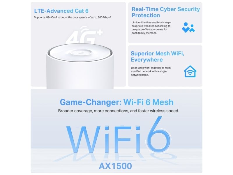TP-Link Deco X10-4G, Hvit, Innvendig lys, Mesh ruter, 190 m², Dobbelbånd (2.4 GHz / 5 GHz), Wi-Fi 6 (802.11ax)