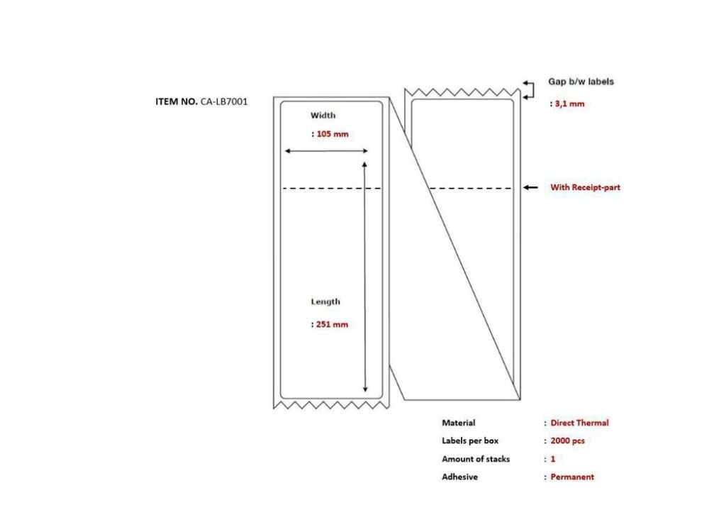 Oppdag effektiviteten og allsidigheten til Captures forbruksmateriell til skrivere, som er utformet for å dekke alle dine behov for merking. Med sin direkte termiske utskriftsteknologi eliminerer dette produktet behovet for blekk eller toner, noe som gir en kostnadseffektiv løsning for virksomheten din. Etikettene har et permanent klebemiddel som sørger for at de holder seg på plass når de er påført, og de er perforerte for enkel separasjon og påføring. Hver etikett måler 105 x 251 mm, noe som gjør dem egnet for en lang rekke oppgaver. I tillegg er de allsidige fordi de har en kvitteringsdel, noe som gir mulighet for en rekke ulike merkingsalternativer. Enten du skal merke produkter, administrere lagerbeholdning eller håndtere frakt, er disse forbruksartiklene en pålitelig og effektiv løsning.