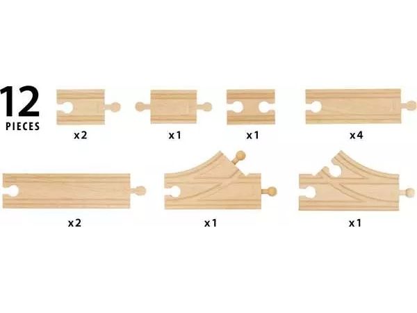 36099 Starter Track Pack includes 12 pieces: 2x Long Straights, 4x Medium Straights, 2x Short Straights, 2x Connectors, 2x Switches.BRIO Starter Track Pack. Type: Track set, Purpose: Toy train, Recommended age (min): 3 yr(s), Number of pieces: 12 pc(s), Product colour: Beige