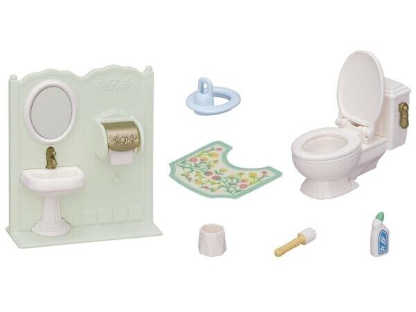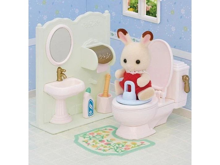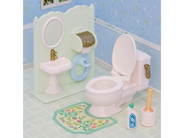 Toiletsættet indeholder toilet, håndvask, rengøringsmidler, pottesæde og toiletmåtte. Du kan skylle toilettet ved at trække i håndtaget og toiletpapiret kan rulles ud. Figurer kan sidde på toilettet. Pottesædet kan fastgøres til toilettet for at toilettræne babyerne. Håndvasken inkluderer spejl, håndvask og toiletpapirholder. Der er endda plads til at opbevare pottesædet. Du kan bruge toiletrenseren og børsten til at rengøre toilettet. Kombiner med Sylvanian-figurer, huse og møbler (sælges separat) for endnu mere sjov. Velegnet til alderen 3+.