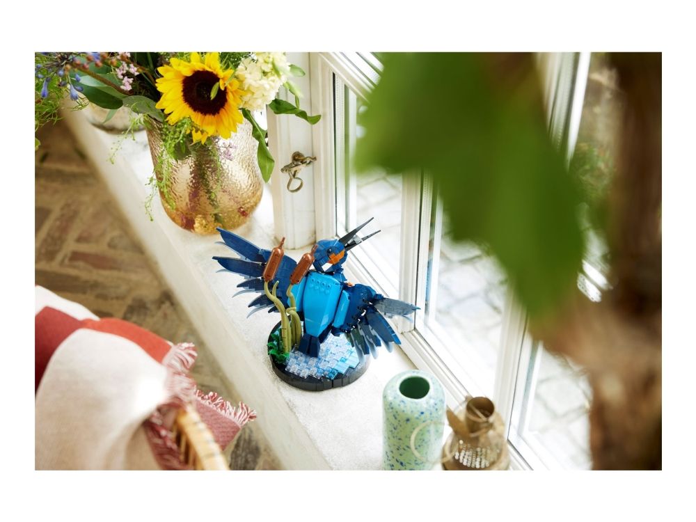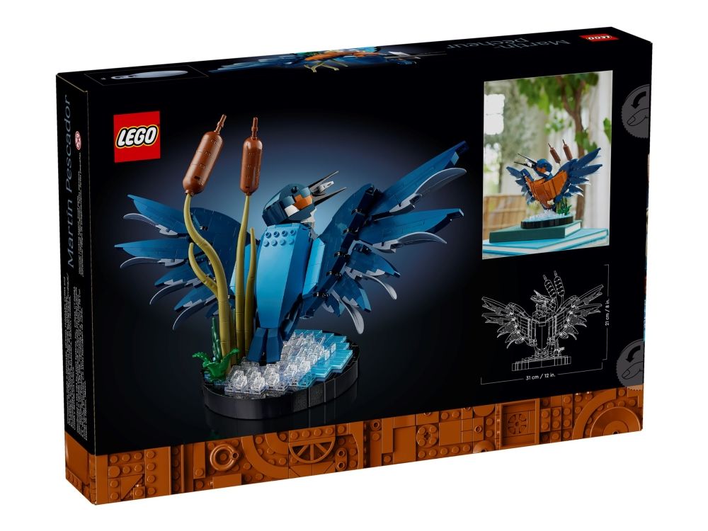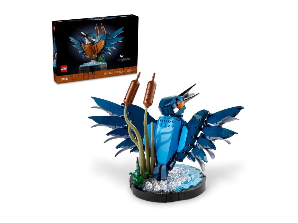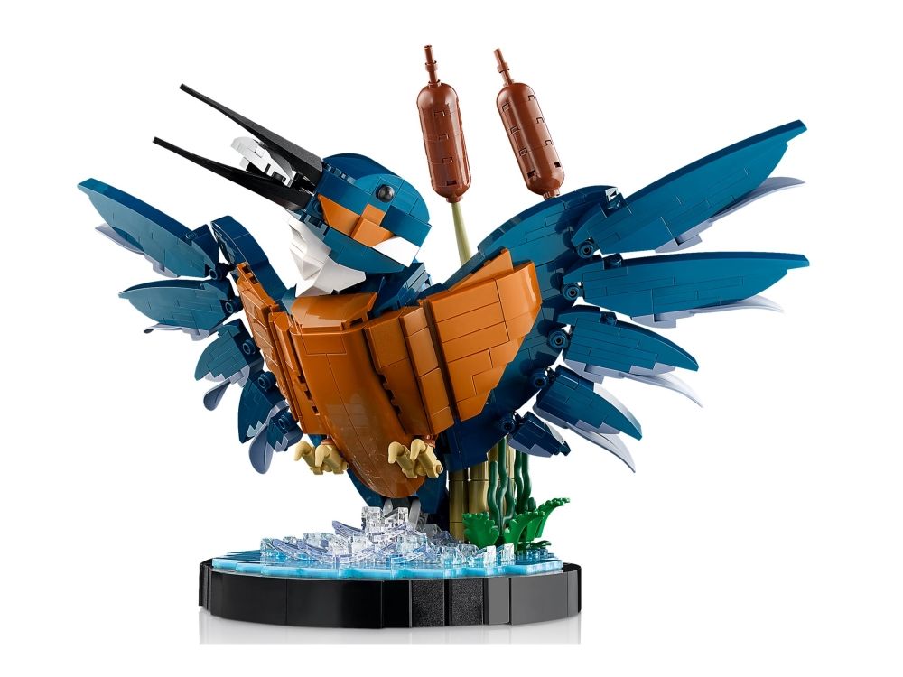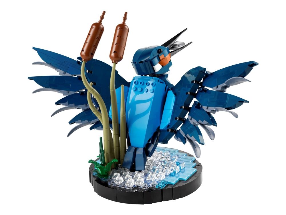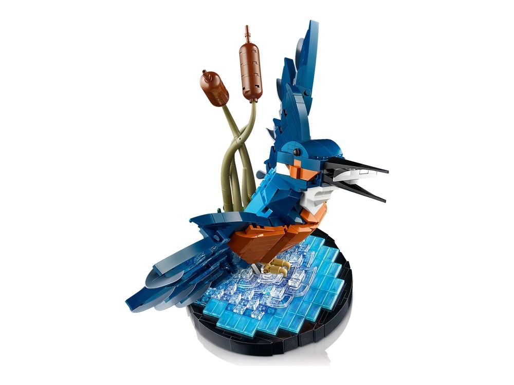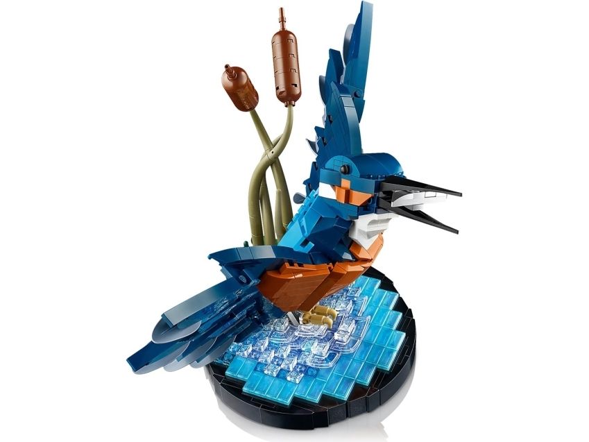 Isfuglen er kjent for sin slående fjærdrakt og fantastiske fiskerferdigheter, og i denne LEGO modellen ser vi fuglen idet den letter fra vannflaten med en fisk i nebbet. Sjø-scenarioet inkluderer byggbare siv og fungerer som en utstillingssokkel. Posisjoner fuglens hode og klør slik du vil, og plasser den deretter på utstillingssokkelen.