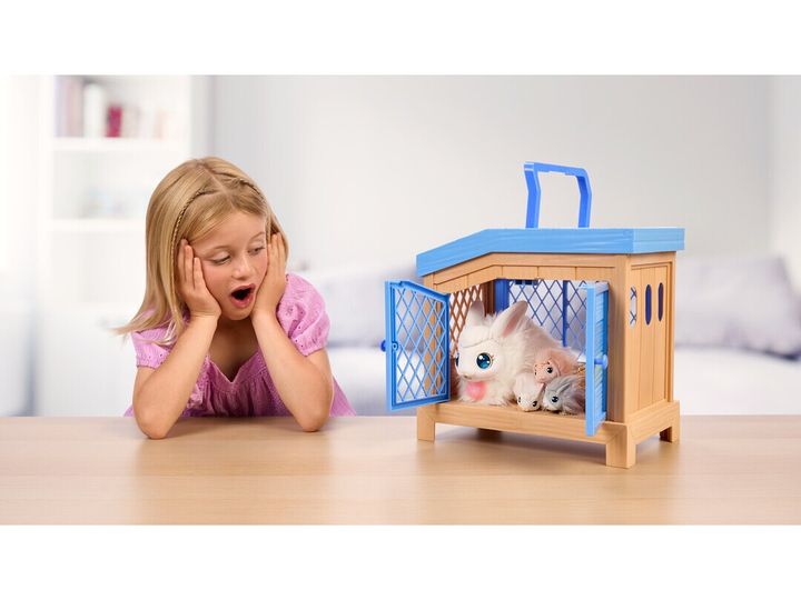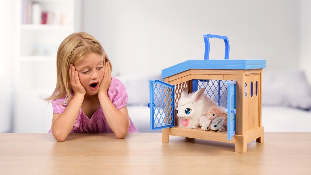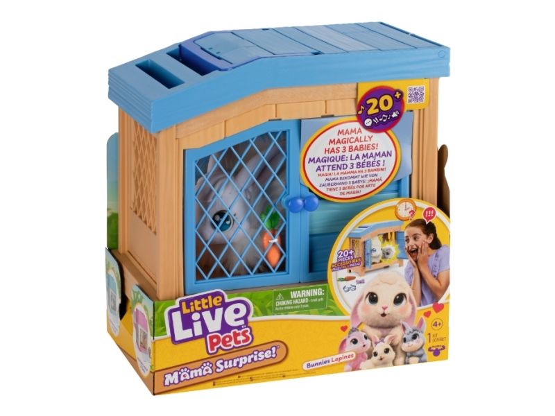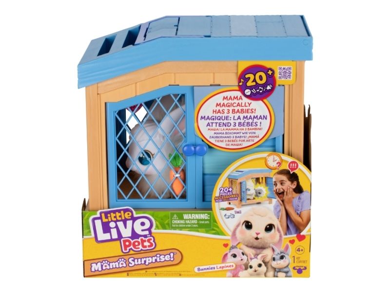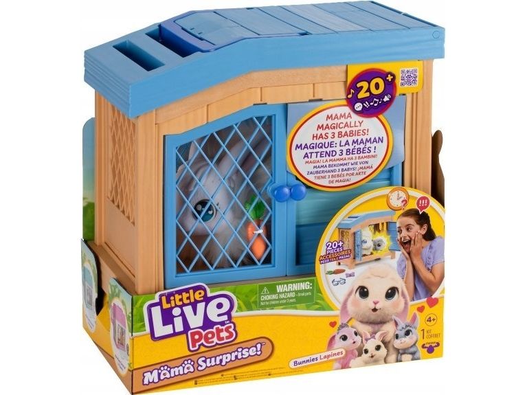 Little Live Pets Mama Surprise – Kanin! Mama Surprise tager pleje af dit kæledyr til et helt nyt niveau. Denne bløde, interaktive mor-kanin kommer med et luksuriøst, interaktivt bur. Pas på mor-kanin, og når hendes hjerte lyser, er en baby på vej. Placer hende i det interaktive bur og vent tålmodigt. Pas på mor-kanin igen, og du vil finde nye kaninbabyer så du kan fuldende din yndige kaninfamilie. Denne magiske oplevelse kan gentages, så du kan gå igennem overraskelsen og glæden ved at passe mor-kanin og opdage hendes babyer igen og igen.