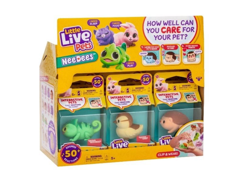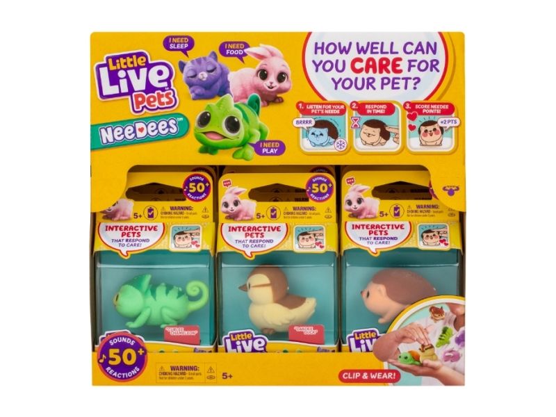 Presenterar Little Live Pets NeeDees - Interaktiva, bärbara vänner som är här för att ge barn oändliga timmar av kul! NeeDees kommunicerar genom 4 olika ljud för att uttrycka sina behov: Lekfull, Kall, Hungrig eller Sömnig, och det är upp till ditt barn att ta hand om och svara på deras NeeDee. Varje svar påverkar deras poäng, vilket uppmuntrar till tidig vård för att förbättra den.