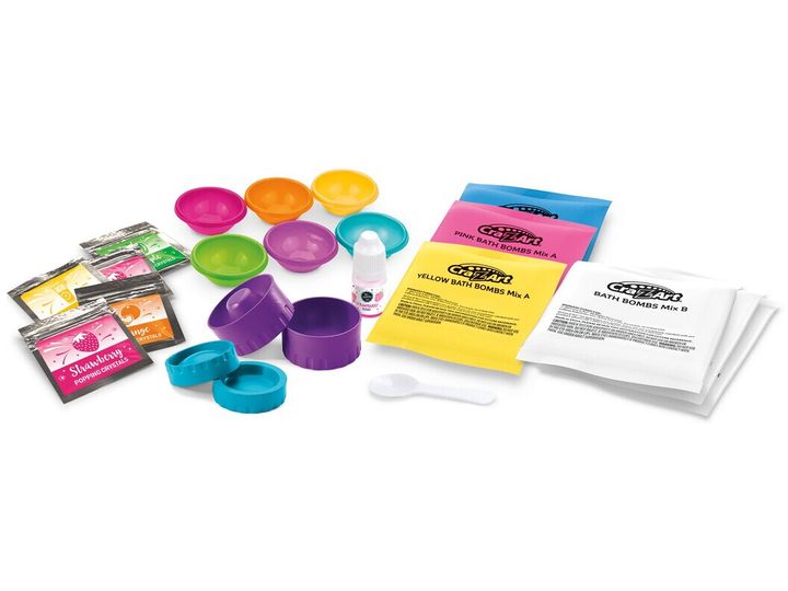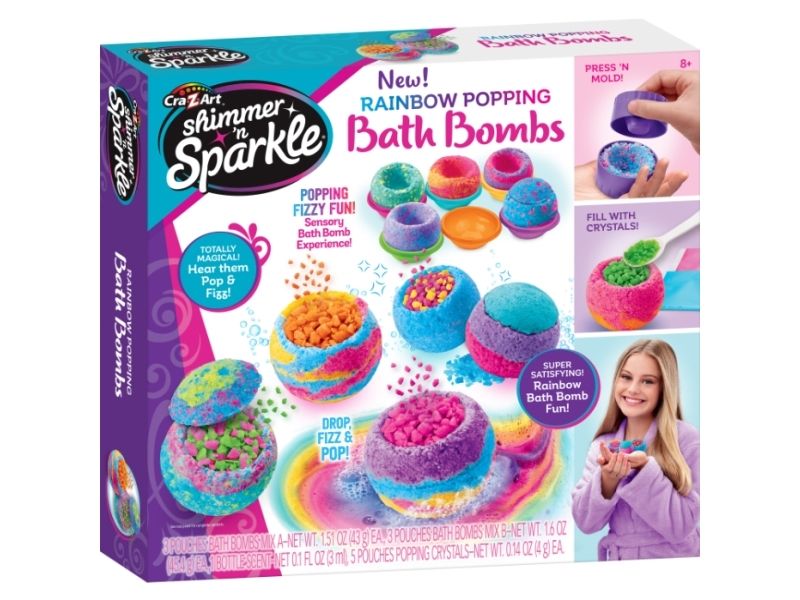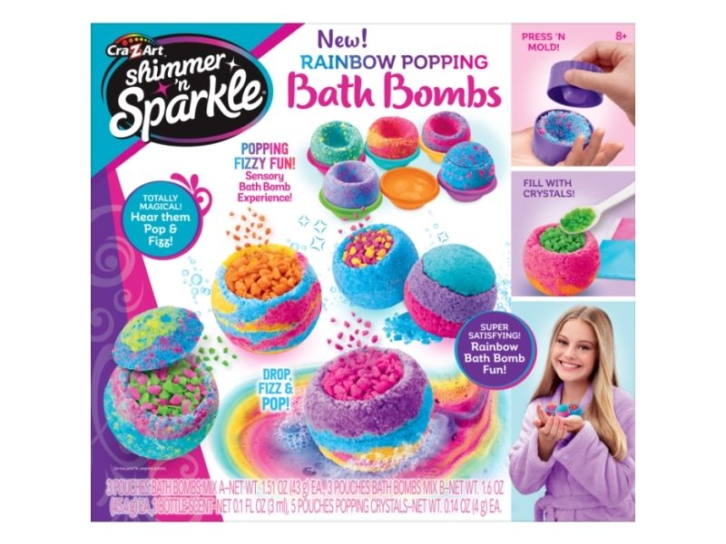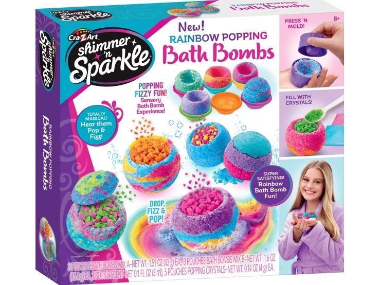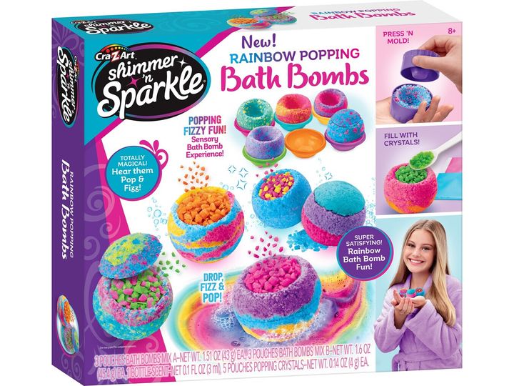 EN FARVERIG REGNBUE BADEBOMBE OPLEVELSE! Gør dig klar til sprudlende boblende sjov med Shimmer n Sparkle Rainbow Popping Bath bombs! Lav levende regnbue duftende badebomber og hør dem poppe og bruse, mens de skaber fantastiske regnbuevirvler! Det er total regnbue-badebombe sjov! SIMPELT OG LET! At lave Rainbow Popping Bath Bombs er så let – tryk, form og fyld simpelthen. Brug de medfølgende forme til at skabe bunden og låget til din badebombe, og når det er tørt, fyld det med magiske poppende krystaller. Tilføj låget, og din badebombe er klar til brug! Nu er du klar til nogle brusende regnbuevirvler! SUPER SANSEOPLEVELSE! Rainbow Popping Bath Bombs er en magisk sensorisk badebombeoplevelse! Slip, brus og pop! Super tilfredsstillende! Hør dem poppe og bruse. Se de smukke regnbuevirvler, når din badebombe rammer vandet, og duft de lækre dufte for en total sensorisk badetidsoplevelse! VÆR KREATIV! Bland og match forskellige farver og krystaller for at skabe forskellige super farverige designs. Lav en badebombe, der er helt din stil! Så mange forskellige kombinationer at udforske og skabe. Du kan blande farverne for at skabe endnu flere regnbuefarver!
