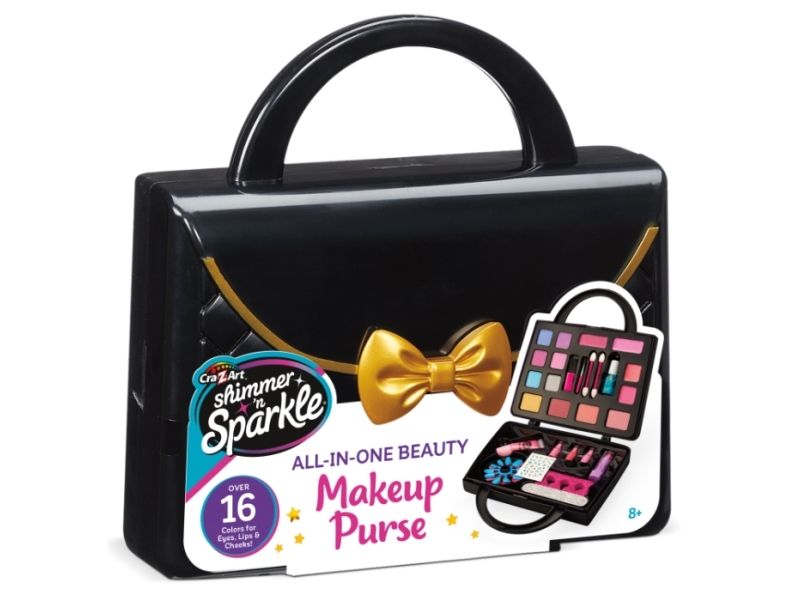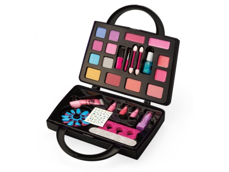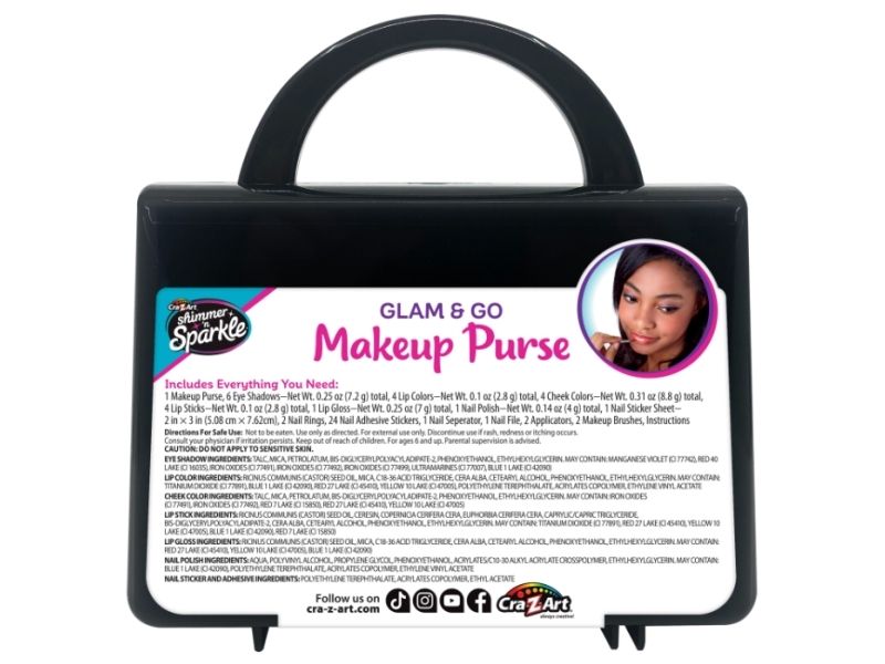 Alt i ett-sminkepungen Shimmer and Sparkle inneholder ordentlig sminke og speil, så barn kan skape sin egen skjønnhetsstil! Inneholder over 16 moteriktige og matchende makepufarger, skapt for å lage perfekte på-farten-stiler: Inneholder 6 x øyenskygger, 4 x rouge, 4 x leppefarger, 1 lipgloss, 4 x leppestifter, 1 x neglelakk, løsnegler, negleklistremerker, neglefil og tåskillere. Settet inneholder også sminkekoster og applikatorer, så du kan påføre sminken som en proff! Lukk sminkepungen og bruk bærehåndtaket til å ta den med overalt, slik at du er klar til å skinne når som helst. Pungen kan brukes som oppbevaring hjemme til alle sminke- og skjønnhetstingene dine. Settet inneholder også Shimmer and Sparkle-klistremerker så du kan pynte både sekken din og deg selv! Dette kosmetikk-lekesettet lager ikke flekker, kan lett vaskes av og er giftfritt.