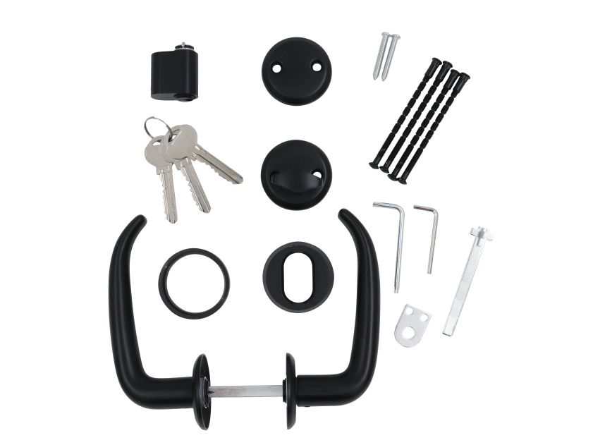 Medfølgende dele: dørgreb, låsecylinder, 3 nøgler og skruer