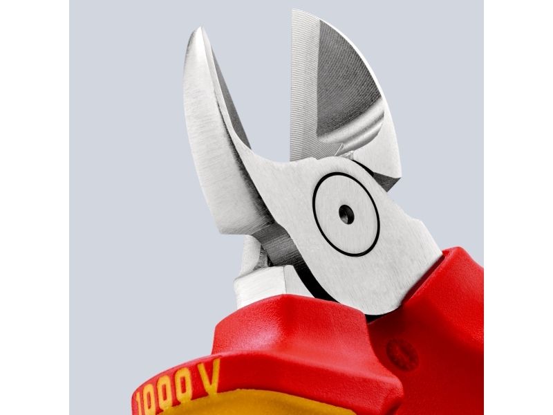 slank hovedform til brug på vanskeligt tilgængelige arbejdsområder. Det uundværlige sideskær til mange forskellige anvendelser. Førsteklasses materiale og præcis forarbejdning for en lang standtid. Præcisions-skær til blød og hård tråd. Pænt snit ved tynde Cu-tråde, selv ved skærspidserne. Skær yderligere induktivt hærdede, skærhårdhed ca. 61 HRC. med forlænget skær. tang med integreret isoleret fastgørelsesøje til brug for anbringelse af sikring mod nedstyrtning.