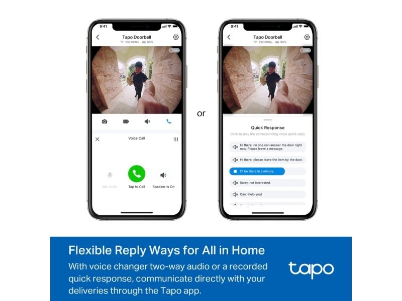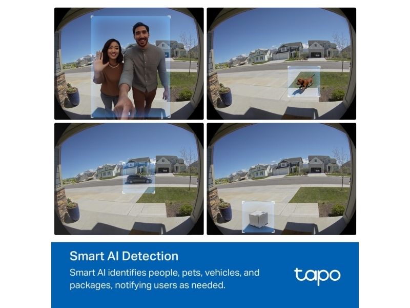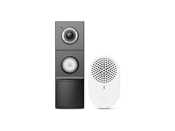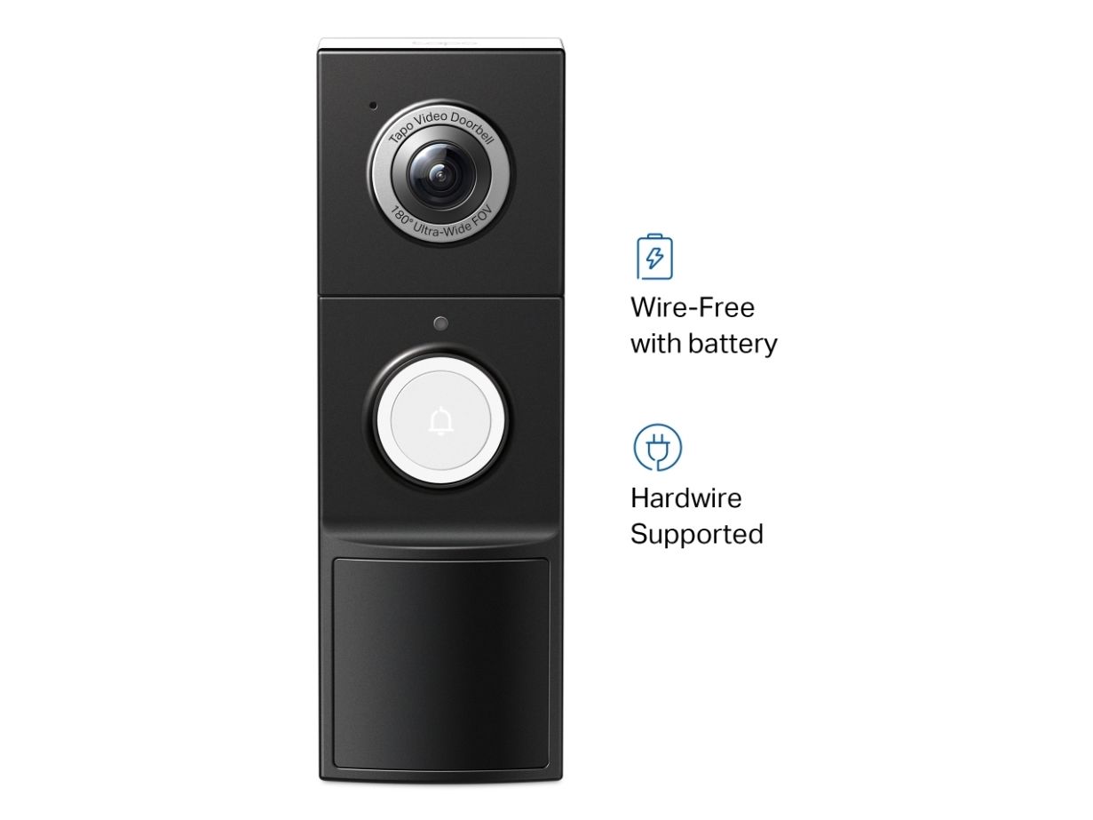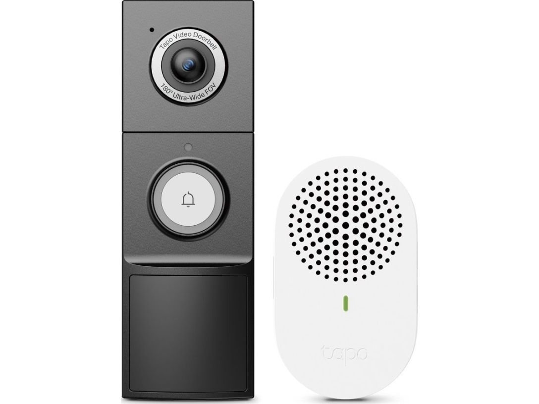 Smart AI identifies people, pets, vehicles, and packages, notifying users as needed.TP-Link Tapo Video Doorbell Camera 1 × D235, 1 × D100C. Product colour: Black, White, International Protection (IP) code: IP66, Detection angle: 130°. Megapixel (approx.): 5 MP, Maximum video resolution: 2560 x 1920 pixels, Maximum frame rate: 15 fps. Connectivity technology: Wireless, Wi-Fi standards: 802.11b, 802.11g, Wi-Fi 4 (802.11n), Security algorithms: WPA, WPA2-PSK. Power source type: Battery, DC, Input voltage: 100 - 240 V, AC input frequency: 50 - 60 Hz. Width: 73 mm, Depth: 48 mm, Height: 54.6 mm