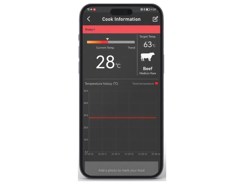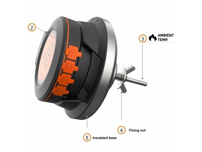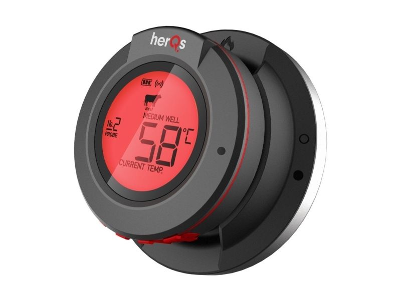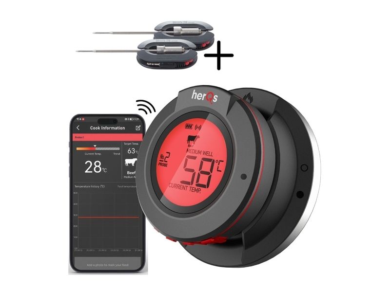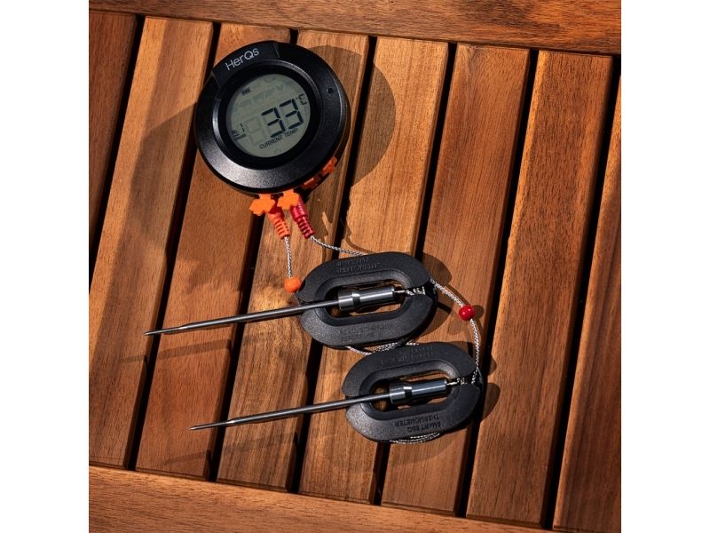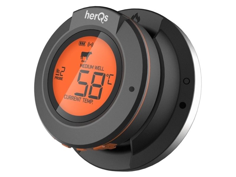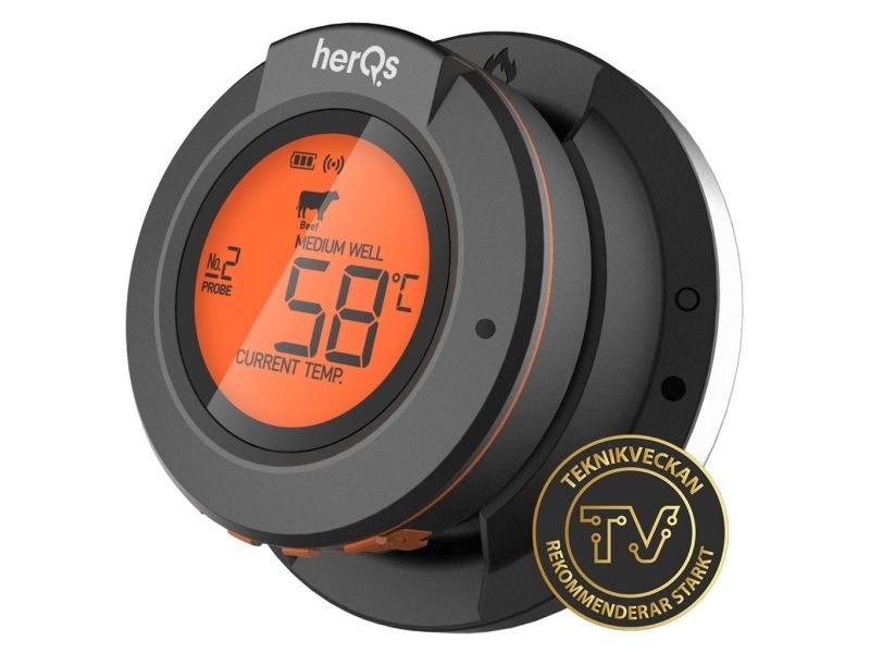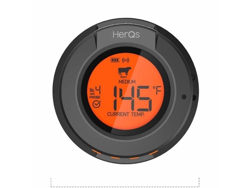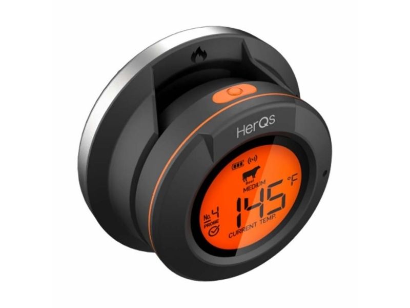 Introducing the herQs Dome Thermometer the essential tool to elevate your grilling experience and ensure perfectly prepared meals every time. With smart connectivity and long-range Bluetooth this thermometer takes the guesswork out of grilling making it easy for anyone to cook like a pro.Smart Connectivity with free herQs appSix-Probe MonitoringLong-Range Bluetooth Connectivity up to 60m Battery Life up to 200 hoursPrecise Temperature Ranges up to 300?Robust Design with IP65 FDA and LFGB certificationSmart Connectivity With the herQs app the Dome Thermometer is always at your fingertips allowing you to select predefined grilling times or customize cooking temperatures. Real-time temperature updates and progress graphs make it easy to monitor your grilling from anywhere. Six-Probe Monitoring The herQs Dome Thermometer supports up to six temperature probes enabling you to watch several dishes simultaneously. This feature ensures that each item on your menu is grilled to absolute perfection. Long-Range Bluetooth With a powerful Bluetooth range of 60 meters outdoors you can mingle relax and enjoy the party without the worry of missing crucial temperature updates. The Dome Thermometer keeps you informed from afar ensuring you never miss a beat - or a steak. Long Battery Life Grill confidently with the HerQs Dome Thermometer's exceptional battery life of up to 200 hours. This allows for long summer barbecues and gatherings without the worry of the device dying. Precise Temperature Range The thermometer measures very accurately up to 300 ? with a minimal deviation allowing you to measure both the general temperature in your barbecue and the temperature within your food. Package includes1x HerQs Dome Thermometer2x Professional stainless steel temperature probes1x Ambient Probe2x AA batteries1x User manualFree herQs appProduct specificationsTemperature deviation: 0-99 ? ±1% / 100-300 ? ±2%Probes: 0-300? / 32 - 572?Power: 2 x AA batteries (included)Display: Backlit LCD screen on Dome and connected deviceAlarms: Customizable for high/low temperatures or as a kitchen timerConnectivity: Bluetooth 4.0 with free herQs BBQ appWater Resistance Rating: IP65Supported Devices: iOS 11.0 or later; Android 5.0 or laterCertificates: FDA LFGB
