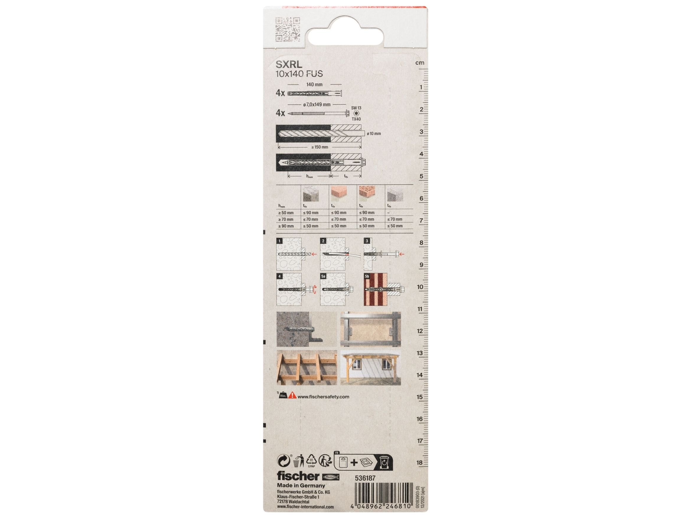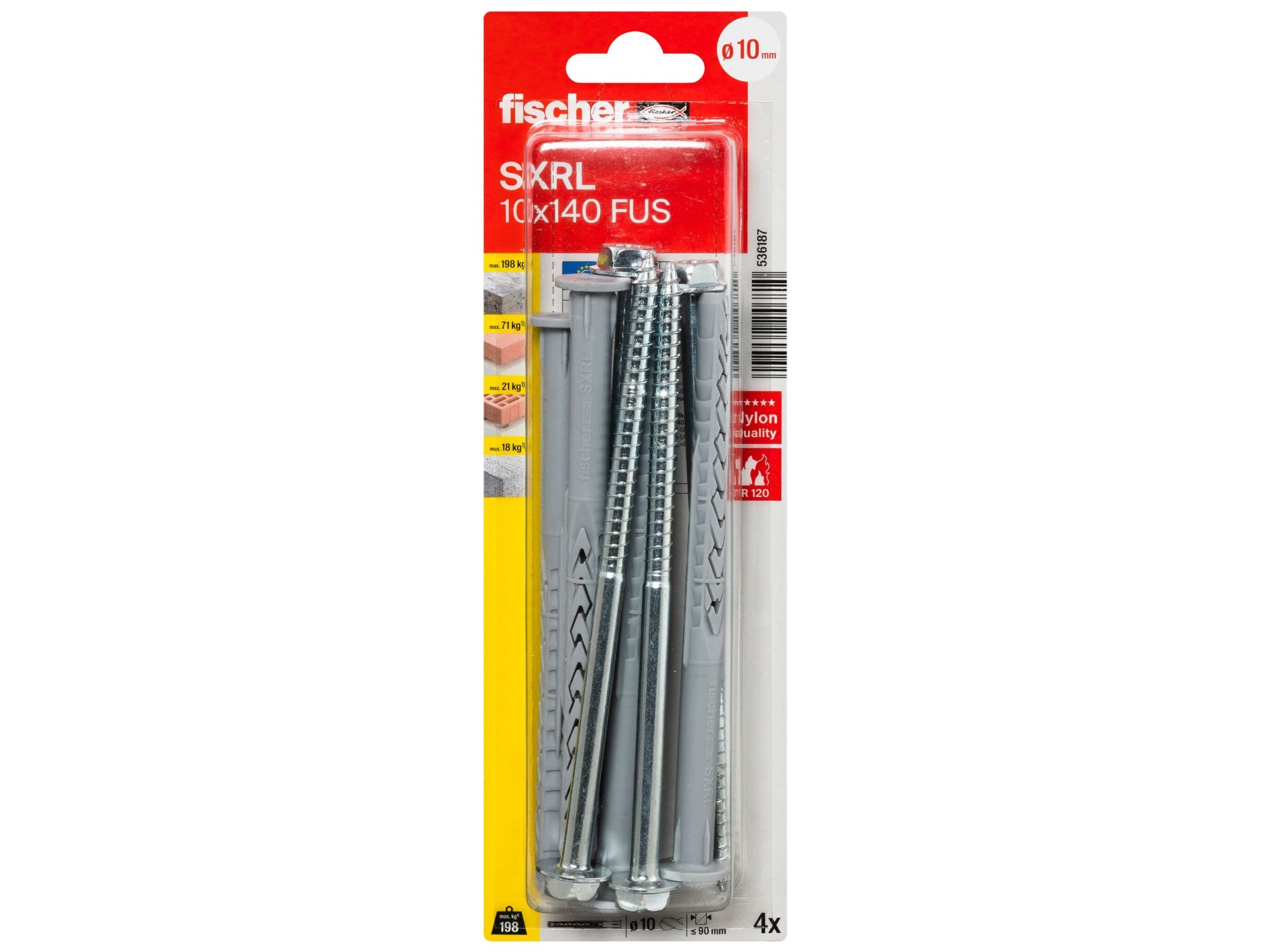fischer-rawlpluggen med langskaftet SXRL-FUS er med fischer-sekskantskrue med tilformet skive og integreret bit-optagelse tilladt til flervægtsfastgørelser af ikke-bærende systemer i murværk, beton og porebeton. I murstensmurværk påleder de to ekspansionszoner på dyvelbeton ensartet kraft, i porebeton og helkonstruktionsmateriale forenes disse i et langt spredeelement. Med sikkerhedsskruen af galvaniseret stål er rawlpluggen egnet til beslag af metalkonstruktioner.