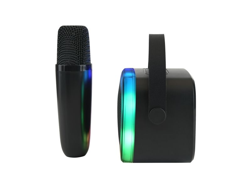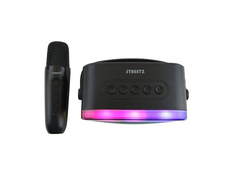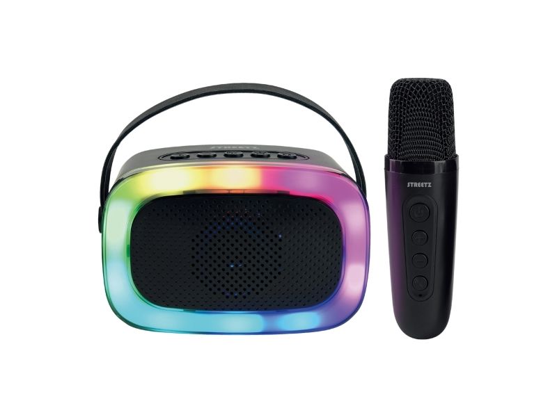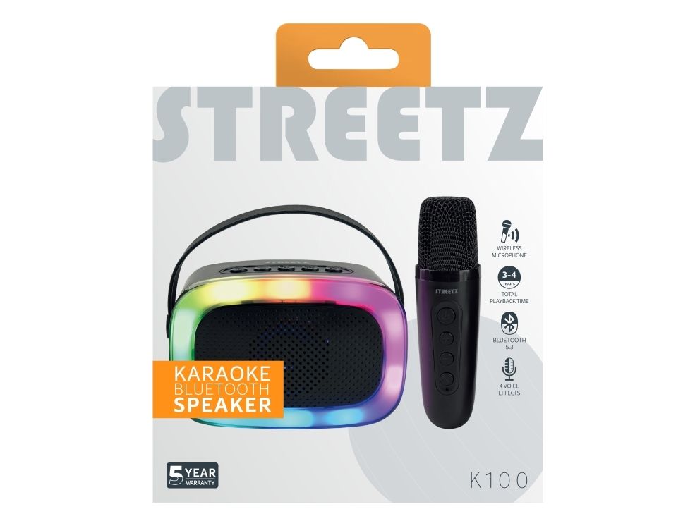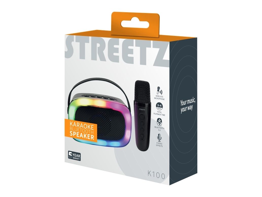 This karaoke speaker with a wireless microphone features vibrant light effects and four voice modes, making it ideal for parties and social gatherings. It's equipped with Bluetooth 5.3, offering a 10-meter range and multiple sound inputs like Bluetooth, micro-SD, USB-A, and AUX for flexibility. The speaker provides up to 4 hours of playtime and charges via USB-C. It’s designed for pre-parties, parties, and other gatherings, offering portable and spontaneous fun for all agesStreetz K100-BLK. RMS rated power: 5 W. Connectivity technology: Wireless, Bluetooth range: 10 m, USB connector type: USB Type-C. Product type: Mono portable speaker, Product colour: Black, Illumination colour: Multi. Recommended usage: Universal, Compatible memory cards: MicroSD (TransFlash). Battery type: Built-in battery, Power source type: Battery, Battery life (max): 4 h
