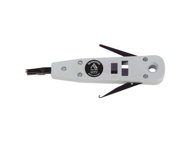 Anlægsværktøj Værktøj til pålægning af kabler på lister. Dåser og felter. Til UTP- og STP-kabel. Lederdiameter 0.4 til 0,8mm. Tryk kablet ind og skær det af i én arbejdsgang. Låsbar skæreanordning. Med integreret træklåse og oplåsningsanordning. Fremstillet i Tyskland