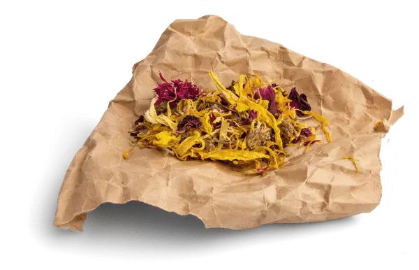 Morgenfrueblomsterblade, rødkløverblomster (30%), rosenblade, røde kornblomstblomster, morgenfruer (3%)