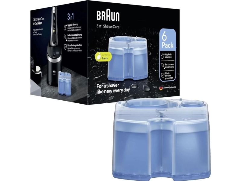 Braun Clean & Renew cartridges will keep your electric shaver feeling like new. The alcohol-based solution cleans more hygiencally than water, removing residual hair and skin particles that cumulate after every shave. High energy lubricants maintain your shaver's blades and help reduce friction, which may cause skin irritation. The lemon-fresh formula releases a refreshing scent, giving you an invigorating shave every time. The Braun Clean & Renew cartrigdes are compatible with any SmartCare Center unit.