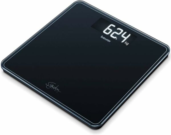 GS 400 Sort glasvægt fra Beurer Signature Line. Beurers egen font på displayet. Stort, sort LCD display med hvide cifre. Cifferhøjde: 39 mm. Ekstra høj vejekapacitet: 200 kg. 8 mm tykt sikkerhedsglas. Mål: 31x31 cm