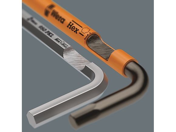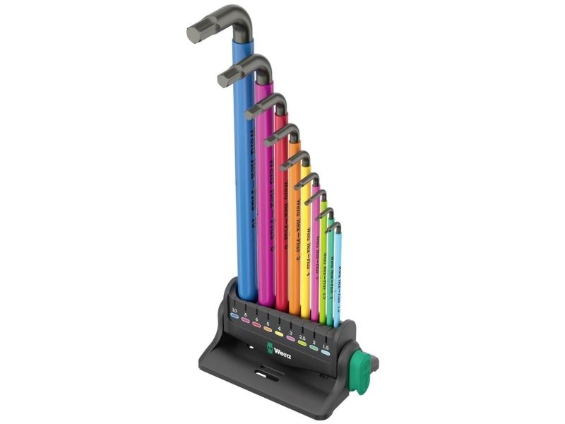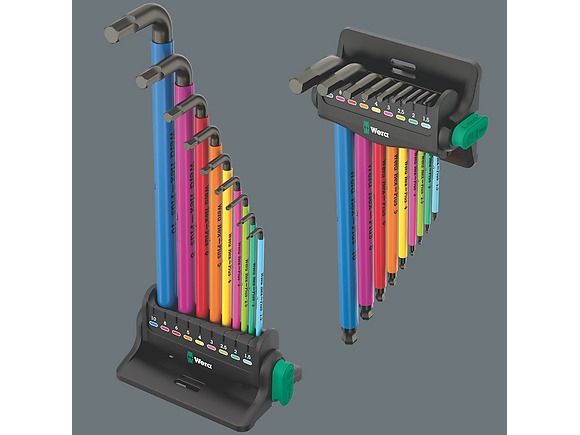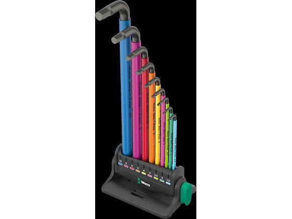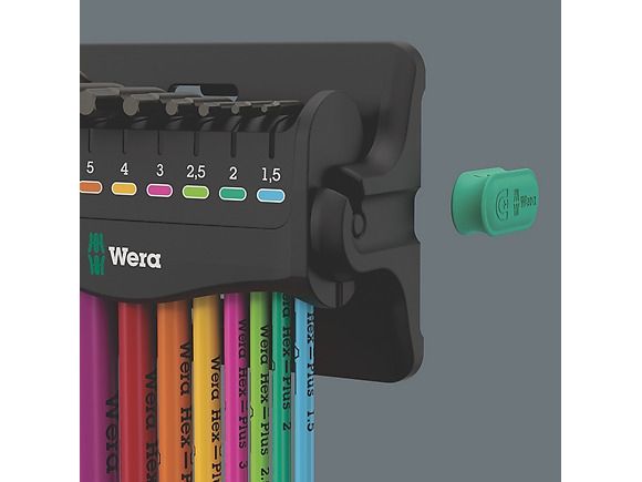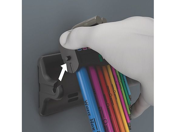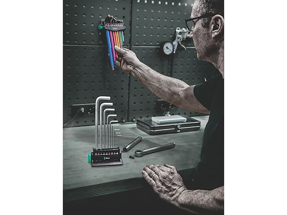 9 vinkelnøgle med plastkappe (SPKL), der er nemt at gribe om rundmaterialet. Beklædningen gør arbejdet behageligt, også ved lave temperaturer, og skåner fingrene. Alle vinkelnøgler er lige ved hånden med farvekodning og mærkning af størrelse. Praktisk opbevaring i rack 9109 til opstilling på bordet eller til fastgørelse på væggen. Rack-integreret clips 9538, der kan tages ud til mobil brug. Rack'en indeholder desuden en smart aftagelig magnetiserer 9538, med hvilken skruer og også værktøjsspidser kan magnetiseres (og afmagnetiseres), så skruen ikke længere med stort besvær fastgøres med den anden hånd.