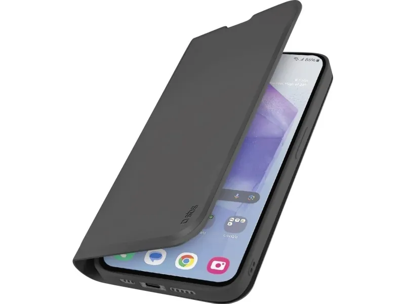 Samsung Galaxy A55 holdes inde i en kant af fleksibelt materiale (TPU), der lader sideknapperne være fri, og hviler på en blød mikrofiberbagside. Takket være den magnetiske lukning kan etuiet bæres i en taske eller rygsæk uden at åbne sig ved et uheld.