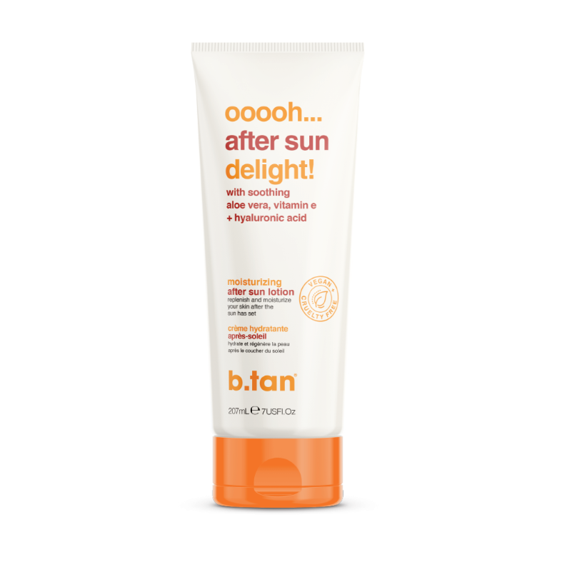 b.tan ooooh aftersun delight….aftersun lotion indeholder hyaluronsyre som er et naturligt sukkerstof og som din egen hud også producerer for at opretholde fugtbalancen i huden. Ved at tilføre hyaluronsyre i denne aftersun lotion boostes huden og holdes gennemfugtet, din hud vil elske dette boost. Denne aftersun lotion indeholder ligeledes kølende og plejende Aloe Vera som er med til at dæmpe og berolige rødme og solbrændt hud.