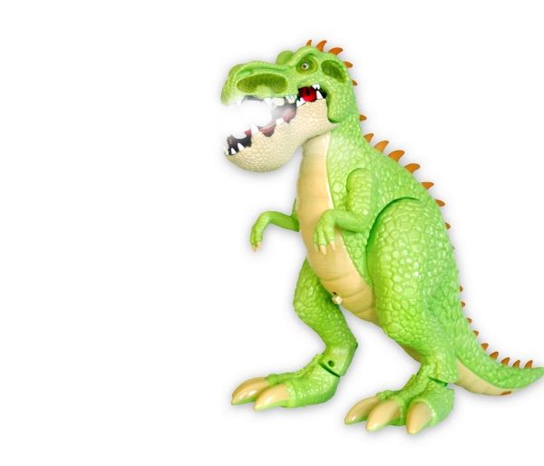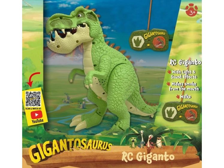 Motorized walking Dinosaur with RC controller; Controller also activates SFX and light-up Dino Breath! Giganto stomps his legs as he moves around. 27 MHz, and about 30cm Height
