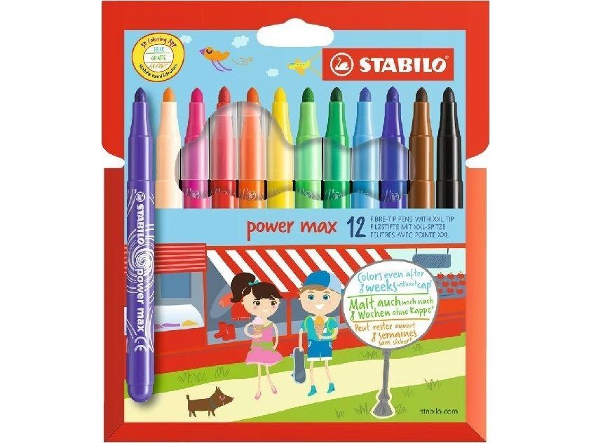 Stabilo Power Max Børnetusch 12 farver - 3mm streg - kan tåle at ligge uden hætte i op til 8 uger uden at tørre ud