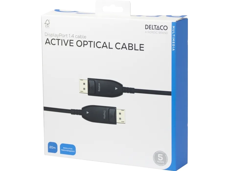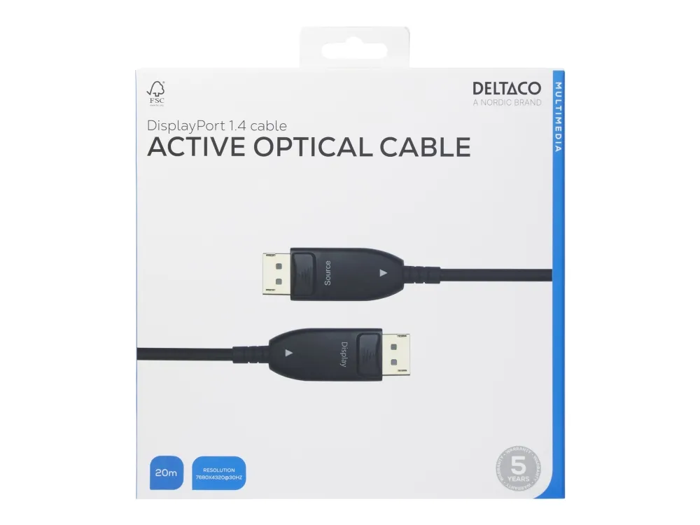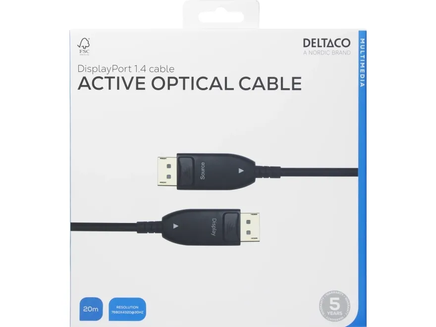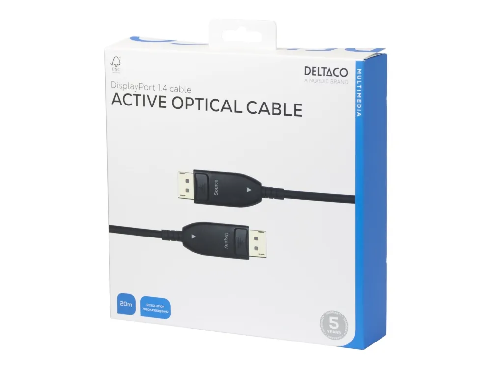 Active Optical Cable (AOC), 8K 30Hz støtte, HBR3 support, maksimal oppløsning 7680x4320 ved 30Hz, maksimal oppløsning 4096x2160 ved 120Hz, opptil 32,4 Gbps båndbredde