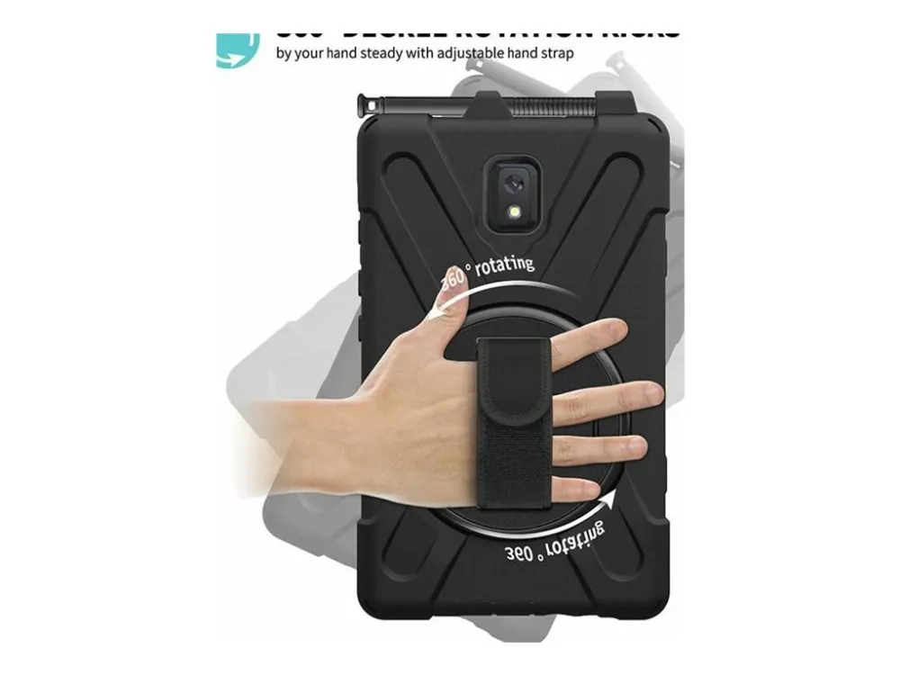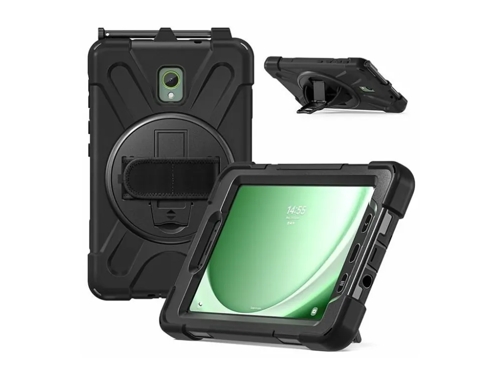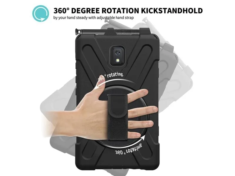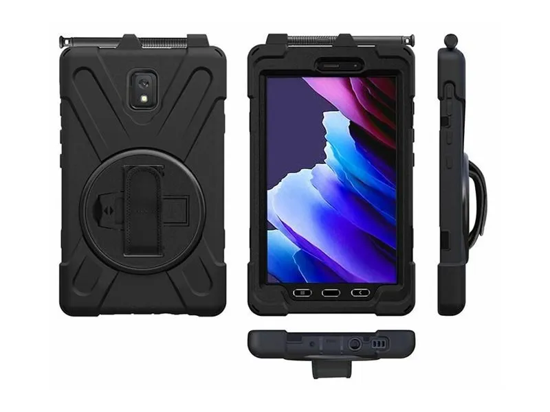 The built-in 360° rotatable kick stand makes it possible to use the tablet in both horizontal and vertical position. Built-in air cushion protection safeguards the tablet corners if the tablet is dropped. The raised sides on both the front and around the camera hole offers better drop protection for the camera and the front glass.