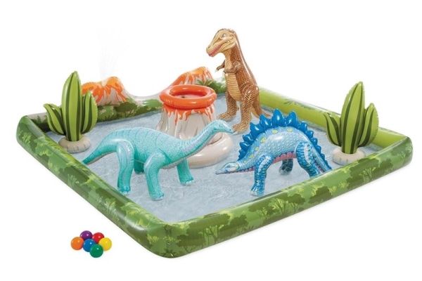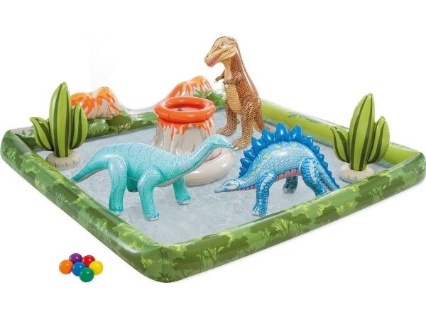 Tenn på barnets fantasi med en forhistorisk scene i hagen din. En innebygd sprøyter holder det kjølig med vann fra hageslangen din. Inkluderer 3 dinosaurer og 2 kaktuser, samt et vulkankastspill med baller. Lekeområdet måler 201 x 201 x 36 cm, med en vannkapasitet på 410 liter. Inkluderer 1 reparasjonsplaster. Fra 24 måneder, under voksenoppsyn.