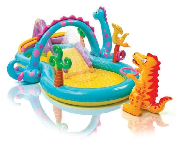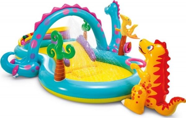 Med dinosaurringer, rutsjebane og vannspreder. Alle barn vil få en fantastisk badedag med dette Dinoland lekebassenget! Gli ned sklia omgitt av søte og morsomme dinosaurer, og plask rundt i bassenget sammen. Bassengsettet inneholder dinosaurringer, en fantastisk kulebane og en vannspruter som enkelt kan kobles til hageslangen. Måler 302 x 229 x 112 cm. Kan inneholde 290 liter vann. Fra 2 år, men under oppsyn av voksne.