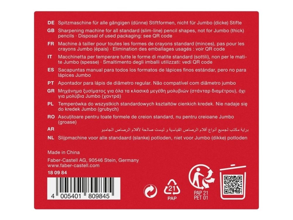 Faber-Castell, a renowned name in craft and art supplies, presents a compact and efficient solution for keeping your pencils sharp and ready. This small-sized rotary sharpener is designed to fit seamlessly into any creative workspace, ensuring your tools are precisely sharpened without the clutter. Its single-hole design ensures that each pencil is sharpened to perfection, making it an essential tool for artists, students, and professionals alike. Experience the blend of Faber-Castell's craftsmanship and practical design with this essential art supply.