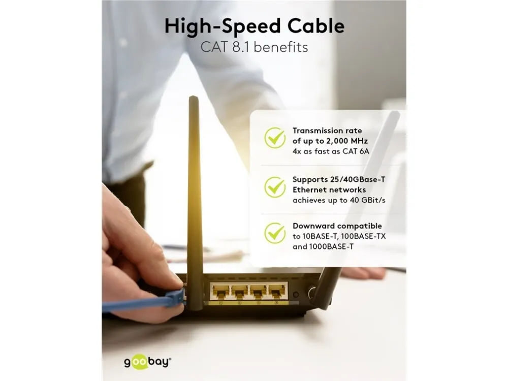 Det 2 m lange parsnoet kabel understøtter 25GBase-T- og 40GBase-T Ethernet-netværk (40 gigabit-kompatibelt) og er nedadkompatibelt med 10BASE-T, 100BASE-TX og 1000BASE-T.