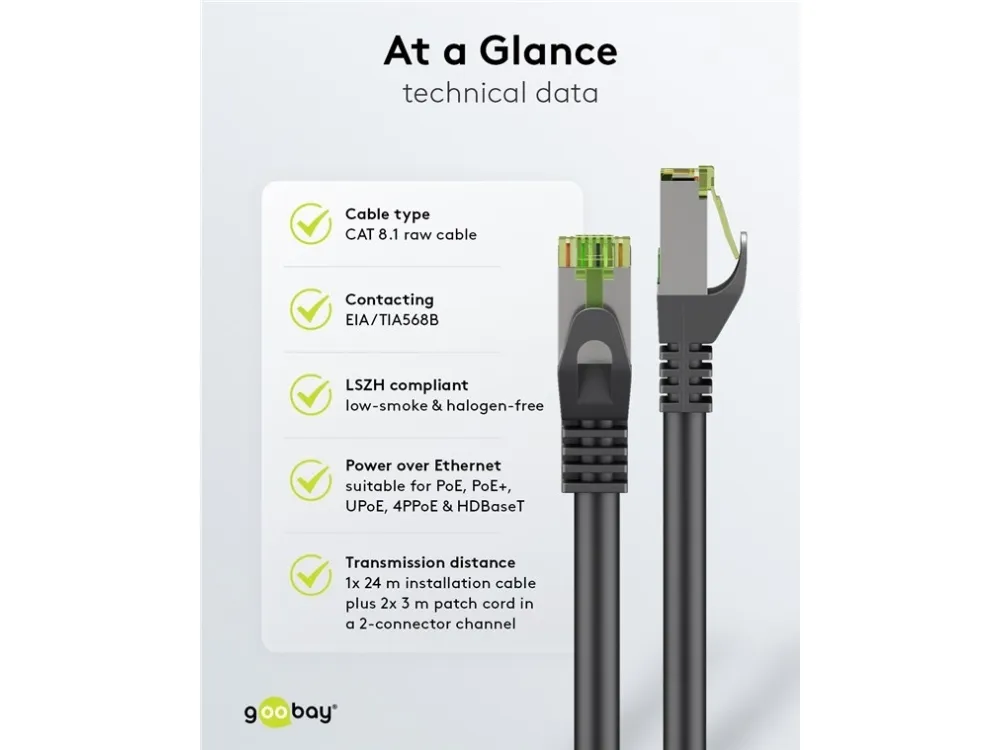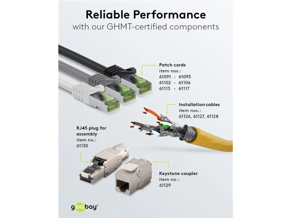 GHMT-certificeret til en transmissionsafstand på 1x 24 m installationskabel plus 2x 3 m patchkabel i 2-connector channel (8.1 Standard Class I med en driftsfrekvens på op til 2 GHz)