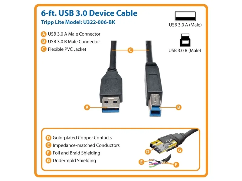 Tripp Lite's SuperSpeed USB 3.2 cable brings significant performance enhancements to the ubiquitous USB standard while remaining compatible with the billions of USB enabled devices currently deployed in the market. SuperSpeed USB will deliver 10x the data transfer rate of Hi-Speed USB (up to 5 Gbps) as well as improved power efficiency. USB 3.2 utilizes a bi-directional data interface rather than USB 2.0's half-duplex arrangement where data can only flow in one direction at a time, giving a ten-fold increase in theoretical bandwidth.