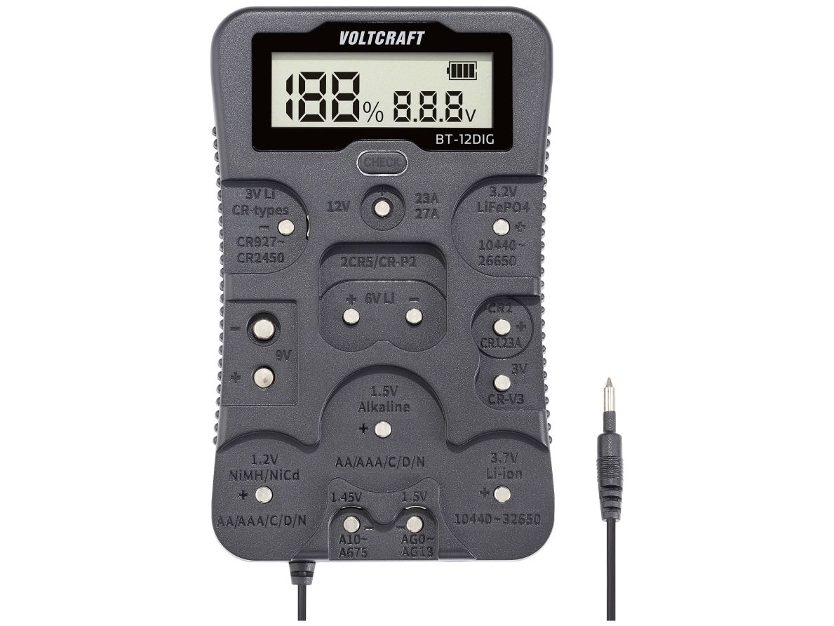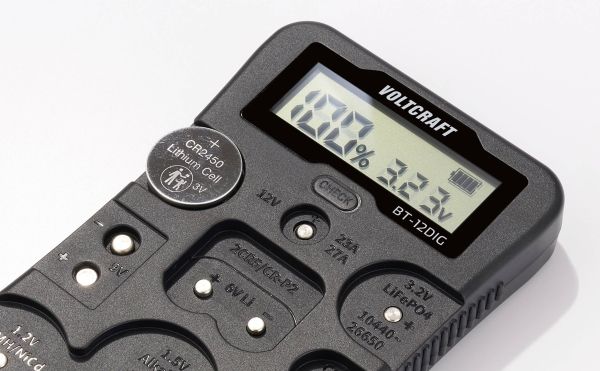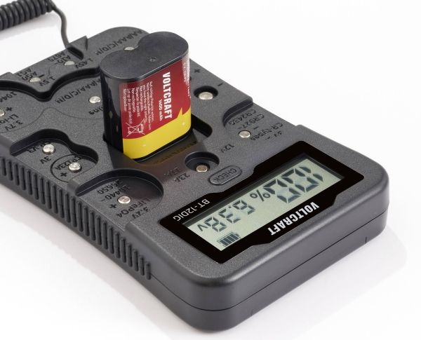 VOLTCRAFT batteritester BT-12DIG måleområde (batteritester) 1,2 V, 1,5 V, 3 V, 3,7 V, 6 V, 9 V, 12 V batteri, batteri VC-14340820 (VC-14340820)