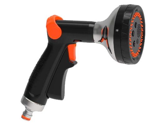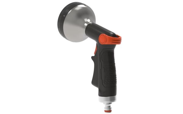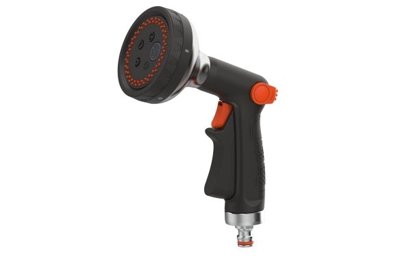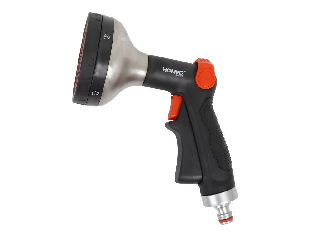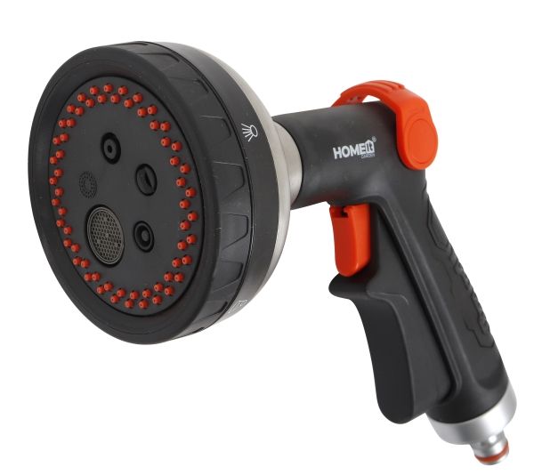 HOME It® Garden Premium brusepistol med komfortbelægning og stort brusehoved. Brusepistolen har tommelfingerbetjent bøjle til indstilling af vandtryk og vandmængde samt 5 forskellige sprayfunktioner, så du kan tilpasse vandingen perfekt i forhold til planterne. Vandet åbnes og lukkes med brusepistolens aftrækker, som af hensyn til betjeningsvenligheden kan låses i åben position.