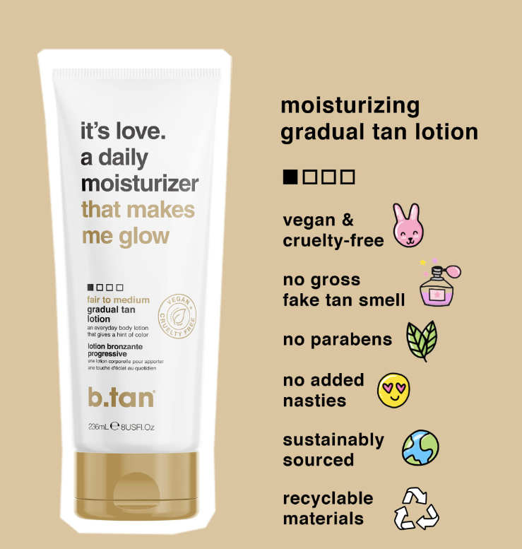 B.tan har formuleret denne body lotion, som nærmest er kærlighed på tube! Produktet er tilsat 100% naturlige DHA-farveaktiver, der giver dig en let og naturlig kulør, så du får en smuk og sund udstråling, der kan bygges op gradvist dag efter dag. Cremen er desuden beriget med nærende naturlige ingredienser, som sørger for at holde din krop sund indeni såvel som udenpå.