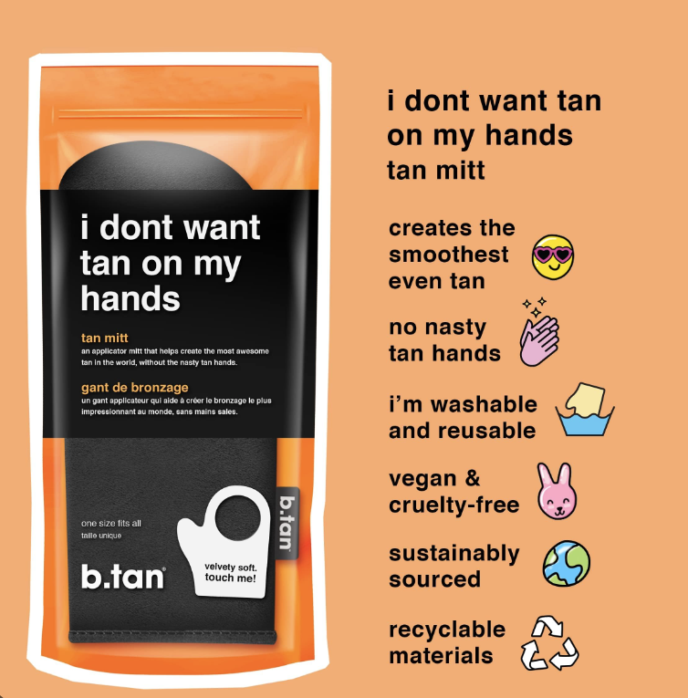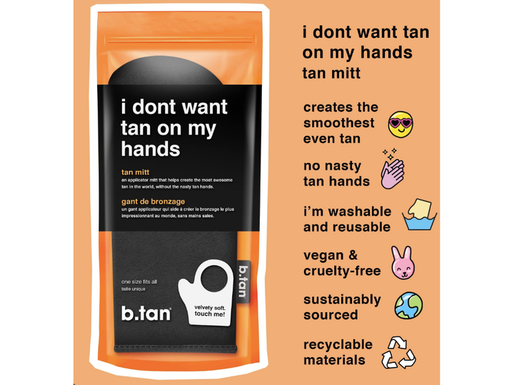 b.tan ‘I dont want tan on my hands” tanning handske er din bedste ven, når det kommer til at fordele din selvbruner hurtigt og jævnt over hele kroppen.