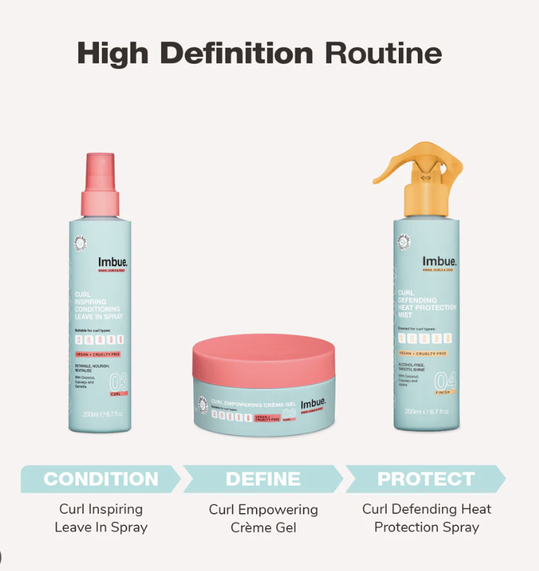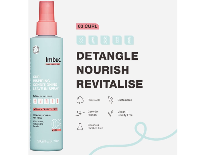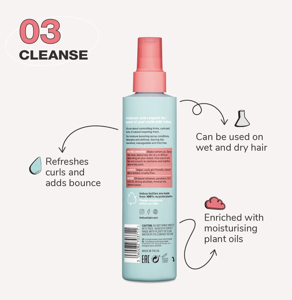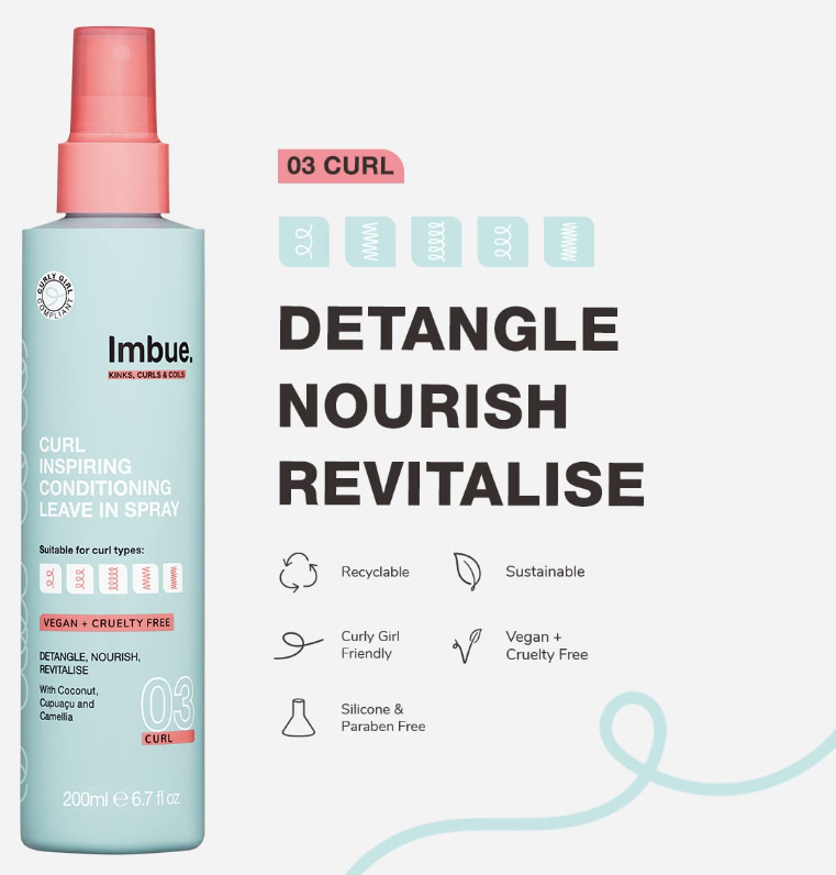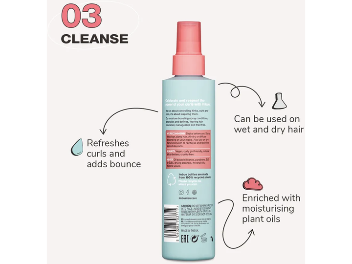 | Produkterne fra Imbue Curls er godtkendt til brug i henhold til Curly-girl metoden Egenskaber: *Leave-in spray til krøllet hår *Fugter, opfrisker og definerer krøller *Gør håret nemmere at håndtere *Giver et blødt hold til håret *Hjælper mod krusset hår *Curly Girl venlig *Vegansk Anvendelse: Anvendes i vådt hår efter du har vasket det, eller i tørt hår for at genopfriske krøllerne. Spray en generøs mængde i hårlængderne og red igennem for at fordele den jævnt. |