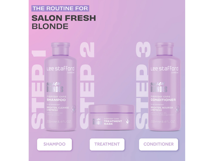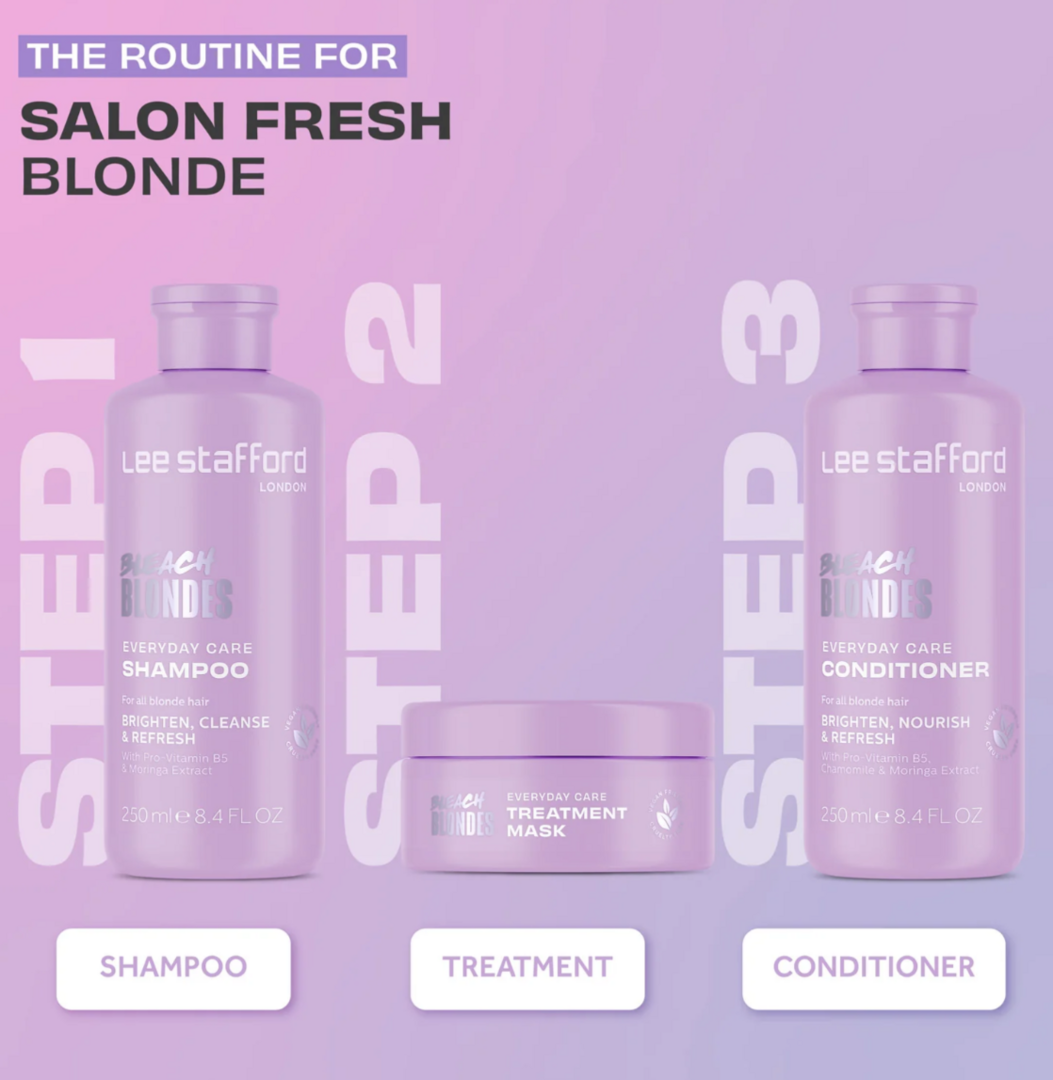 Trin 1: Massér Lee Stafford Bleach Blondes Everyday Care Shampoo ind i vådt hår. Skyl og gentag.