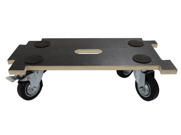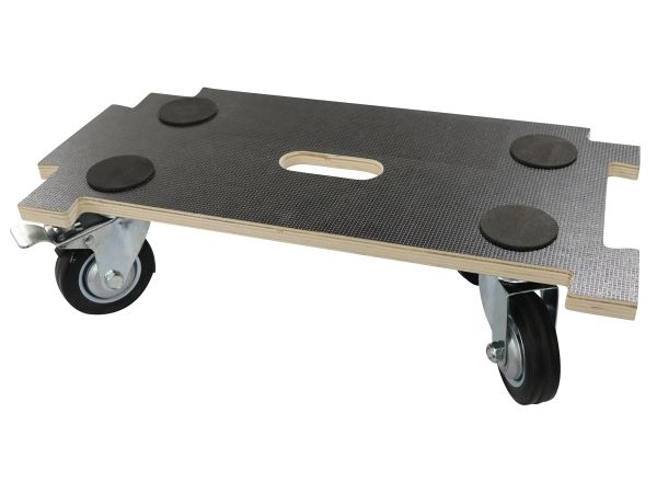 Koblingsbar møbelhund i 18 mm krydsfiner med skridsikre felter og 4 gummi drejehjul, hvoraf 2 har bremse. Kan sammenkobles med andre møbelhunde for større flade og stabilitet.