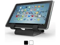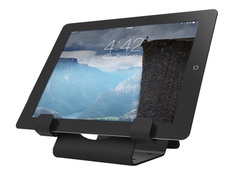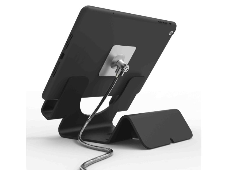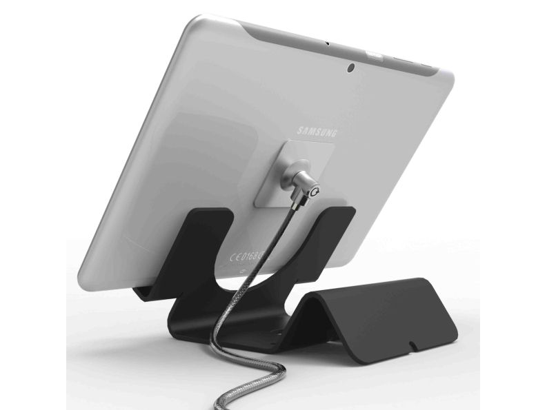 The simplified design still has its unique features that distinguish it from the cluttered pack of tablet stands on the market. Positioned at a 45 degree angle for optimal viewing with an open back design to fit the locking point and security cable. The stand has a patented balance stabilizer that serves as a cable trap to keep your cords in order and from being stolen.