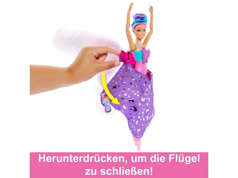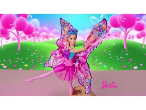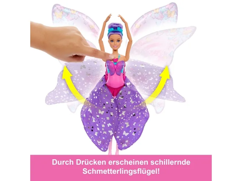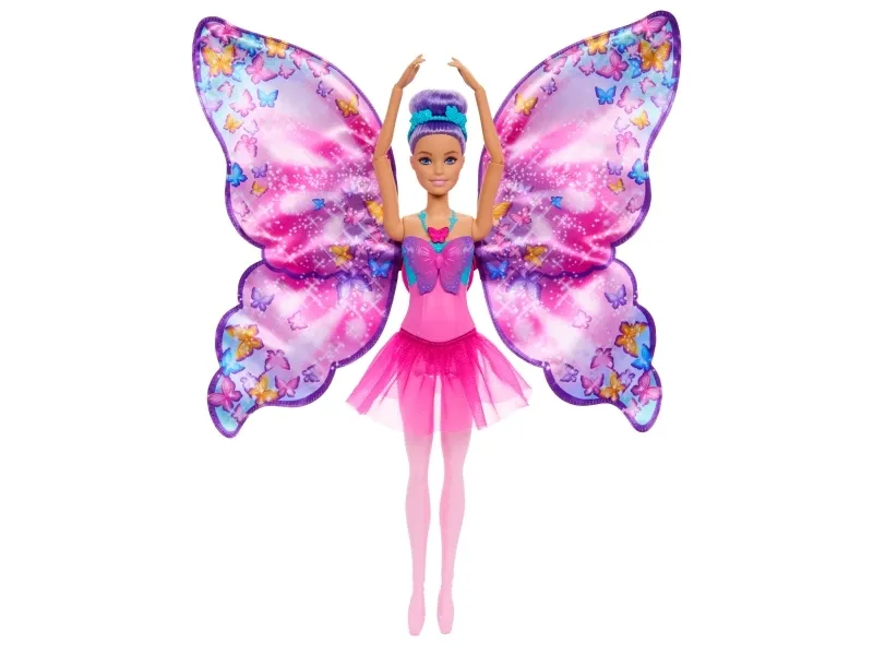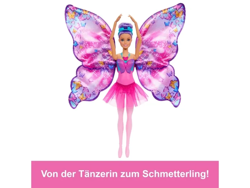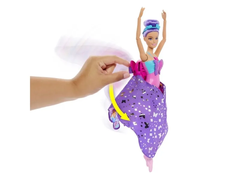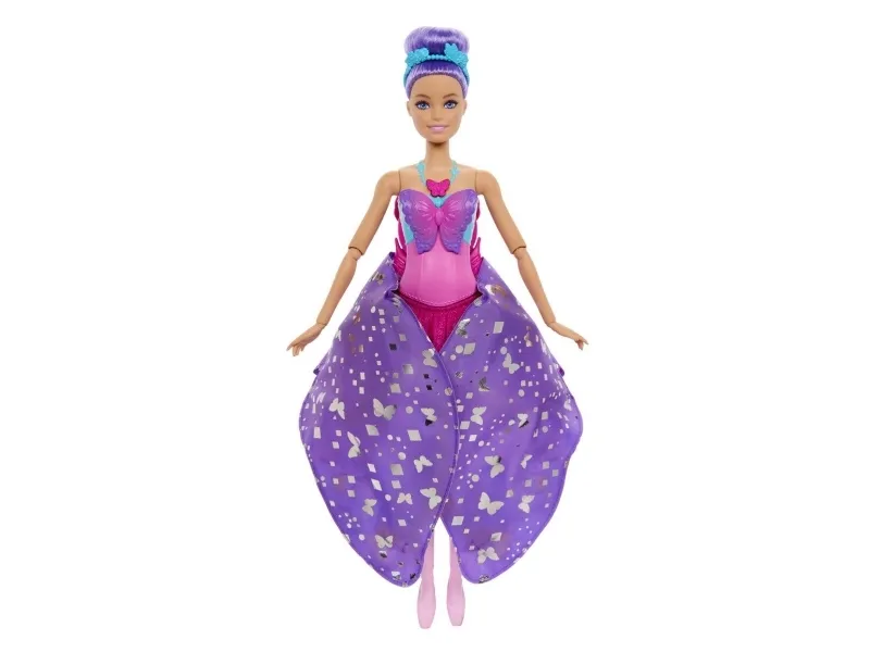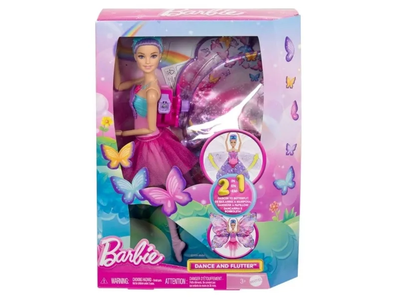 Inspire imaginations to fly with Barbie Dance and Flutter doll and a 2-in-1 magical transformation! Simply press the necklace on the doll's bodice and watch her purple overskirt unfurl like magic into large shimmering butterfly wings. It's a wow moment that kids will love activating again and again. An enchanting purple bun hairstyle with floral headband, dazzling bodice and ballet slippers complete the gorgeous look. Makes a fantastical gift for kids ages 3 years old and up. Doll cannot stand alone. Colours and decorations may vary.Barbie Dance and Flutter Doll with 2-in-1 Transformation from Dancer to Butterfly, Purple Hair. Doll type: Fashion doll, Doll's gender: Female, Recommended age (min): 3 yr(s), Suggested gender: Girl. Height: 360.6 mm, Weight: 111 g. Material: Fabric, Plastic, Product colour: Multicolour