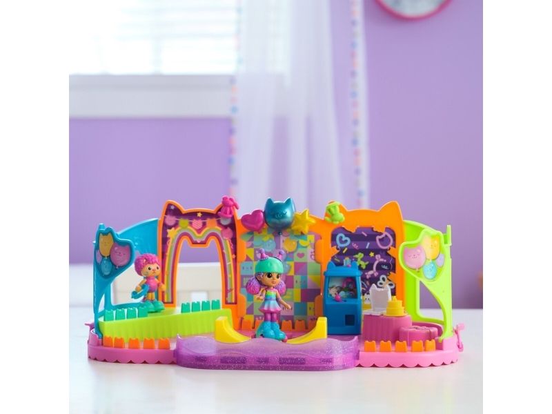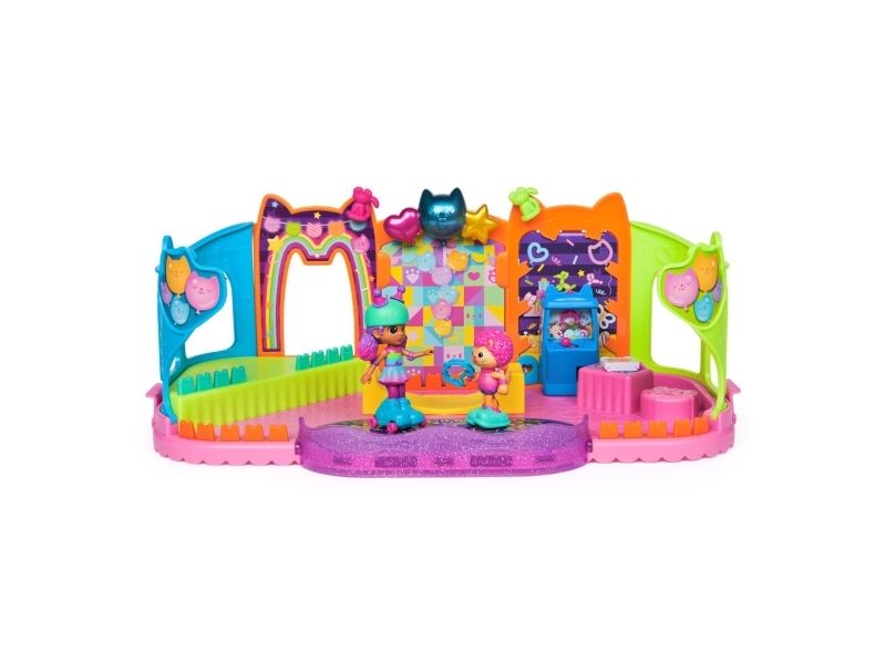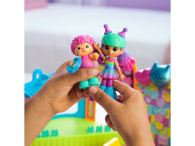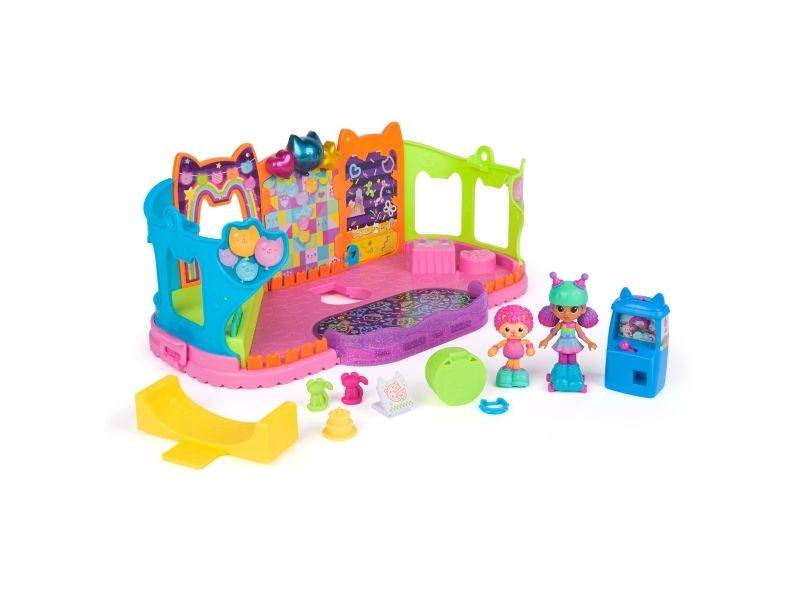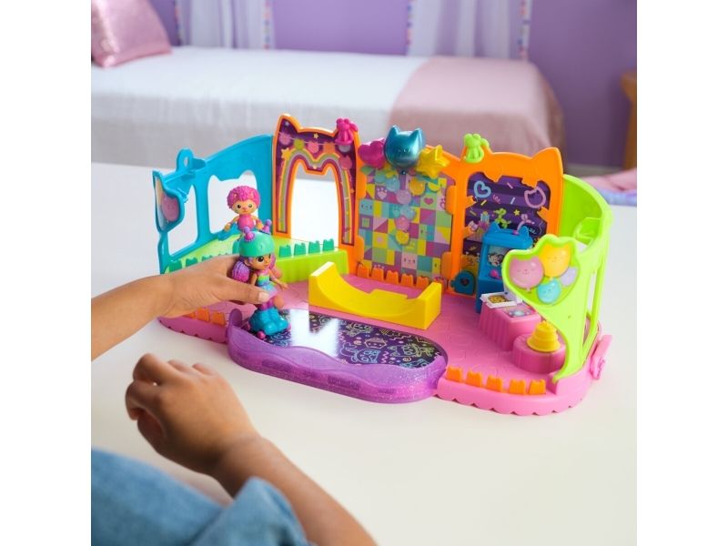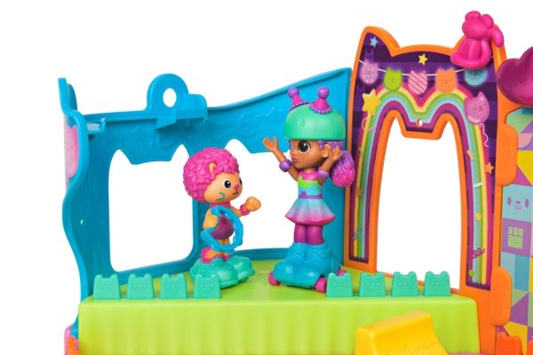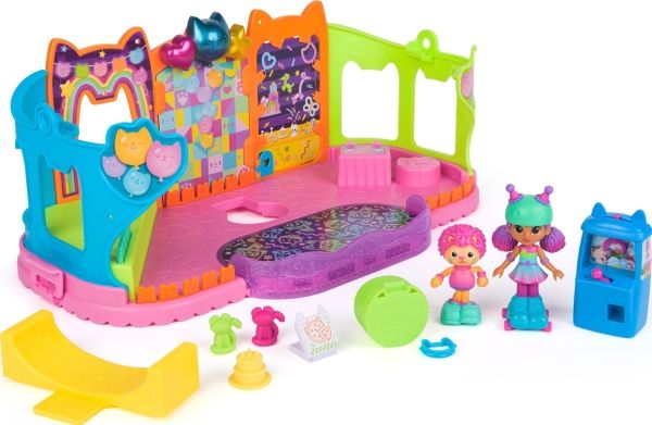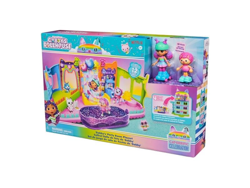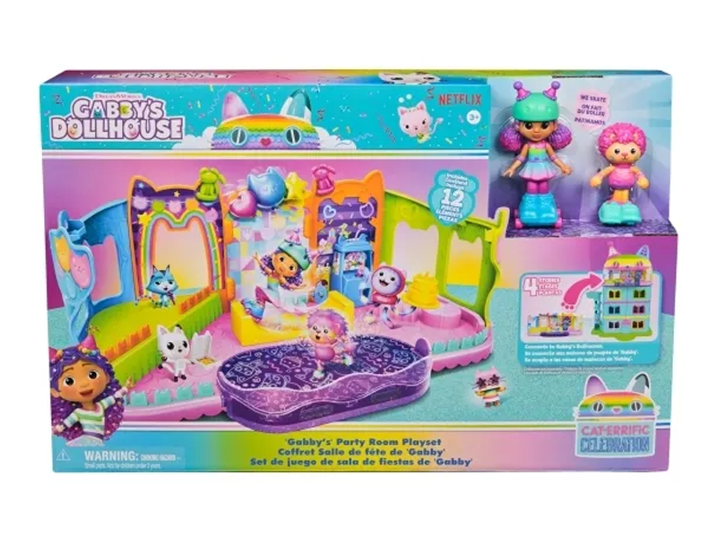 Step into the magical world of Gabby’s Dollhouse with Gabby’s Party Room Playset! This set includes exclusive 4-inch Skater Gabby and Skater Marty the Party Cat toy figures with working skates! Decorate the Party Room with dollhouse accessories & furniture, then enjoy sensory play with fidget toys on the Party Room wall! For even more fun, attach the Party Room to Gabby’s Dollhouse to raise the dollhouse up to 4-stories-tall and then access the party room with the doll house cat-a-vator! Gabby’s Dollhouse toys for girls & boys are great gifts for kids who are fans of the hit Netflix series and enjoy building pretend play doll house worlds. Make their entry into dollhouse play memorable with a world of lovable toy figures, dollhouse accessories and dollhouse furniture to collect and configure! Build your world with house kit essentials like a play kitchen or a music room, and tons of items to collect, like an awesome cruise ship toy, a mermaid themed pool and the all-new Party Room Playset - dollhouse attic with an indoor skate park, and super cute dollhouse balconies with mini fidget toys, that provide satisfying sensory play, and work seamlessly with both versions of the dollhouse!