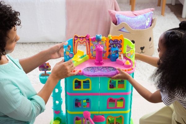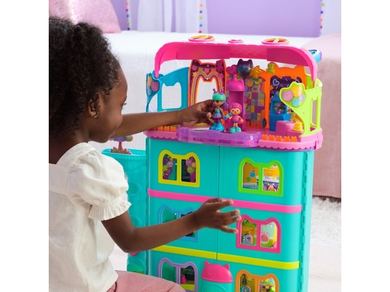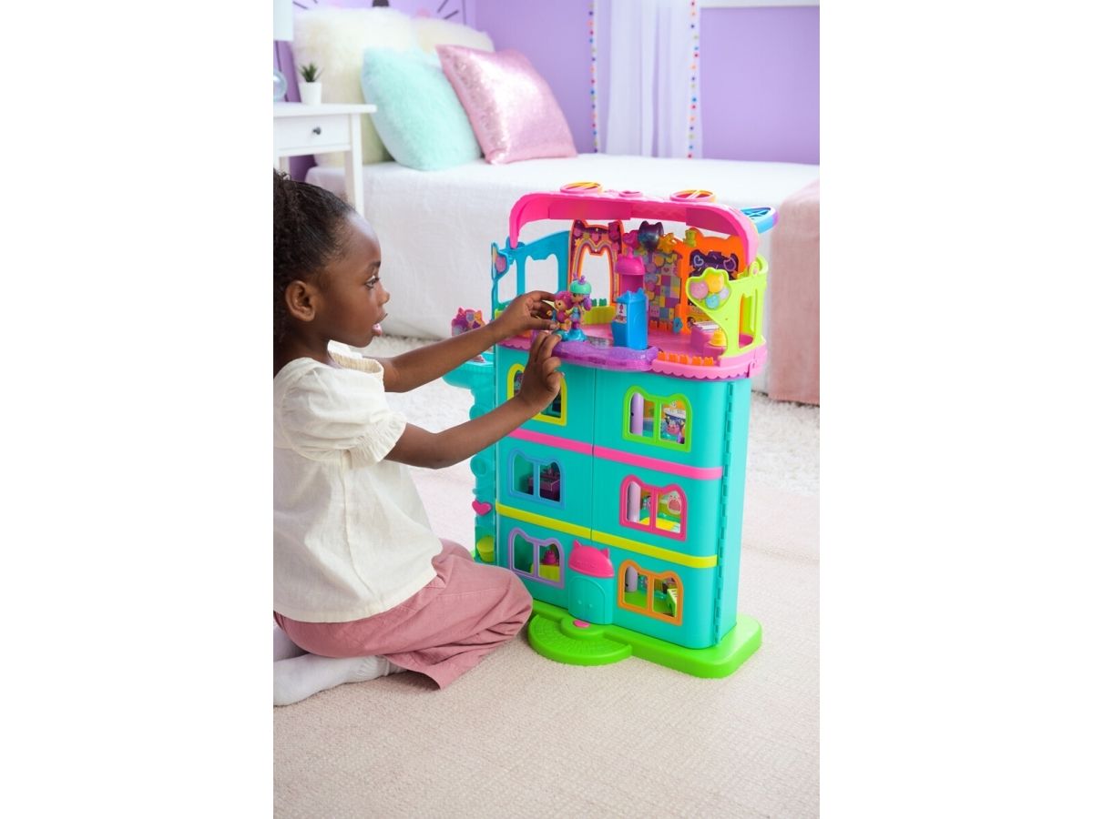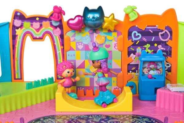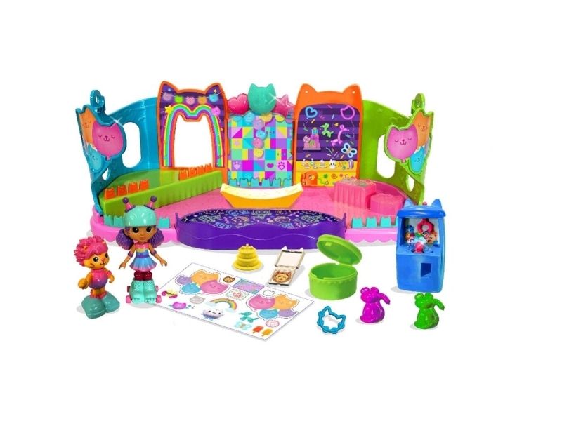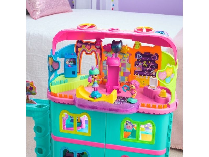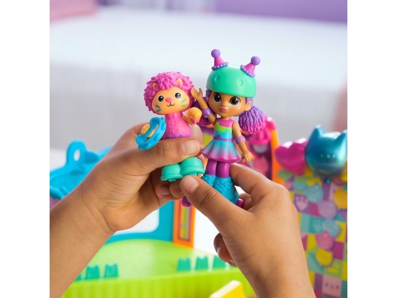 Step into the magical world of Gabby’s Dollhouse with Gabby’s Party Room Playset! This set includes exclusive 4-inch Skater Gabby and Skater Marty the Party Cat toy figures with working skates! Decorate the Party Room with dollhouse accessories & furniture, then enjoy sensory play with fidget toys on the Party Room wall! For even more fun, attach the Party Room to Gabby’s Dollhouse to raise the dollhouse up to 4-stories-tall and then access the party room with the doll house cat-a-vator! Gabby’s Dollhouse toys for girls & boys are great gifts for kids who are fans of the hit Netflix series and enjoy building pretend play doll house worlds. Make their entry into dollhouse play memorable with a world of lovable toy figures, dollhouse accessories and dollhouse furniture to collect and configure! Build your world with house kit essentials like a play kitchen or a music room, and tons of items to collect, like an awesome cruise ship toy, a mermaid themed pool and the all-new Party Room Playset - dollhouse attic with an indoor skate park, and super cute dollhouse balconies with mini fidget toys, that provide satisfying sensory play, and work seamlessly with both versions of the dollhouse!