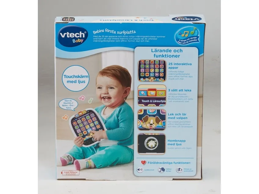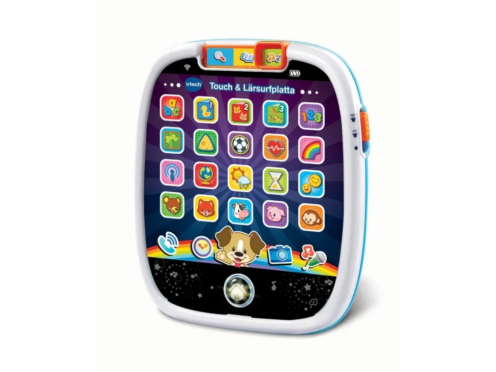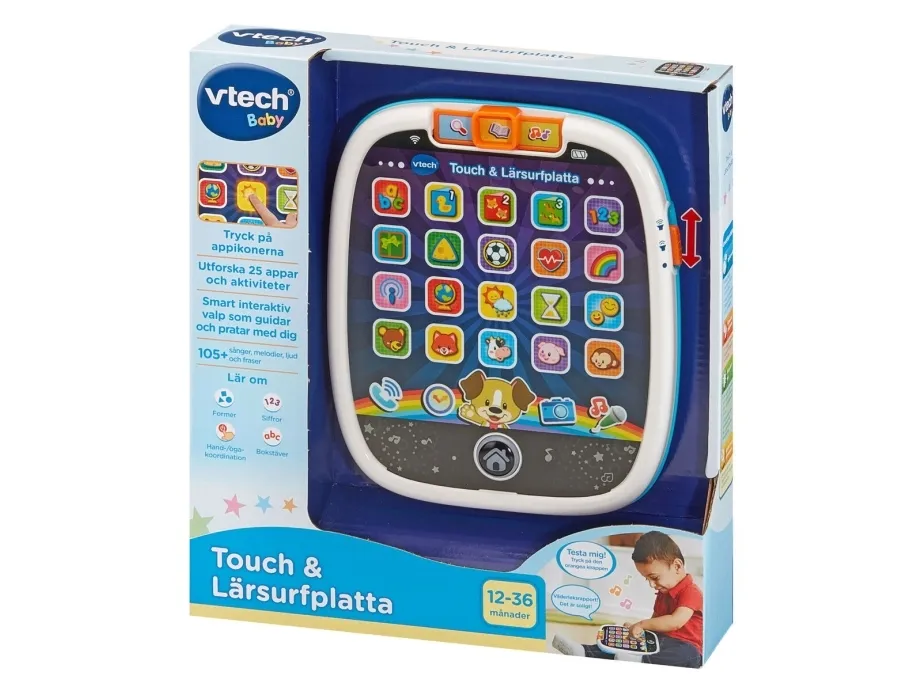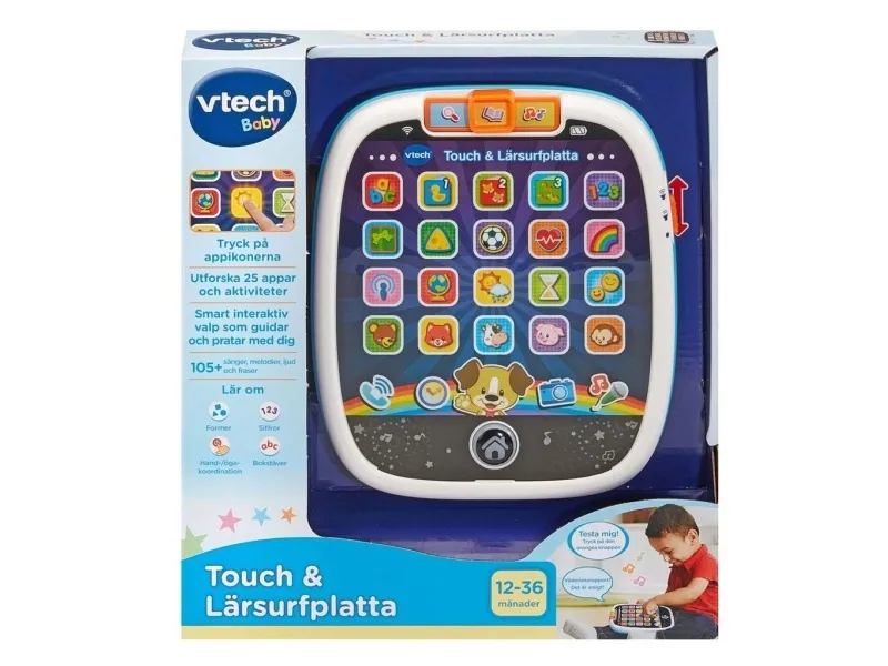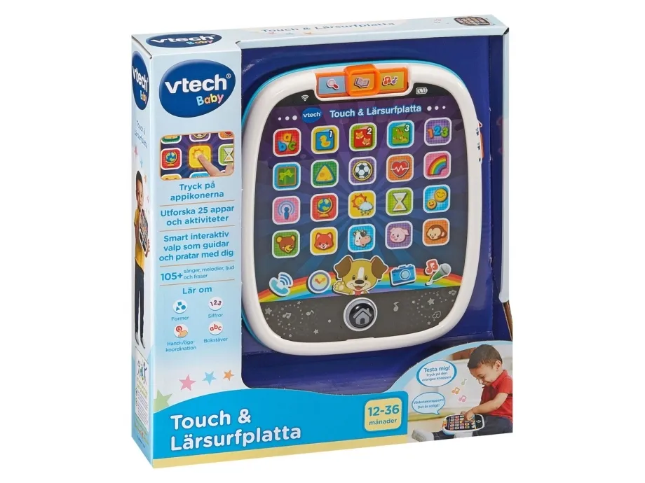 Ditt barn får en egen surfplatta med Touch & Teach Tablet från VTech! När de trycker på de 25 app-knapparna med låtsasljus för att utforska och lära sig tidiga färdigheter, inklusive siffror, former, djur, färger, bokstäver och mycket mer. Små barn kan också ta virtuella bilder, ringa på låtsas och se vad klockan är! Det finns 3 leklägen: utforska, musik och lära sig. Hemknappen lyser upp och genom att svepa längs knapparna aktiveras roliga ljusmönster. Med 3 sånger att sjunga med i och 20 melodier. Den här leksaken med massor av kul håller små barn engagerade i timmar.