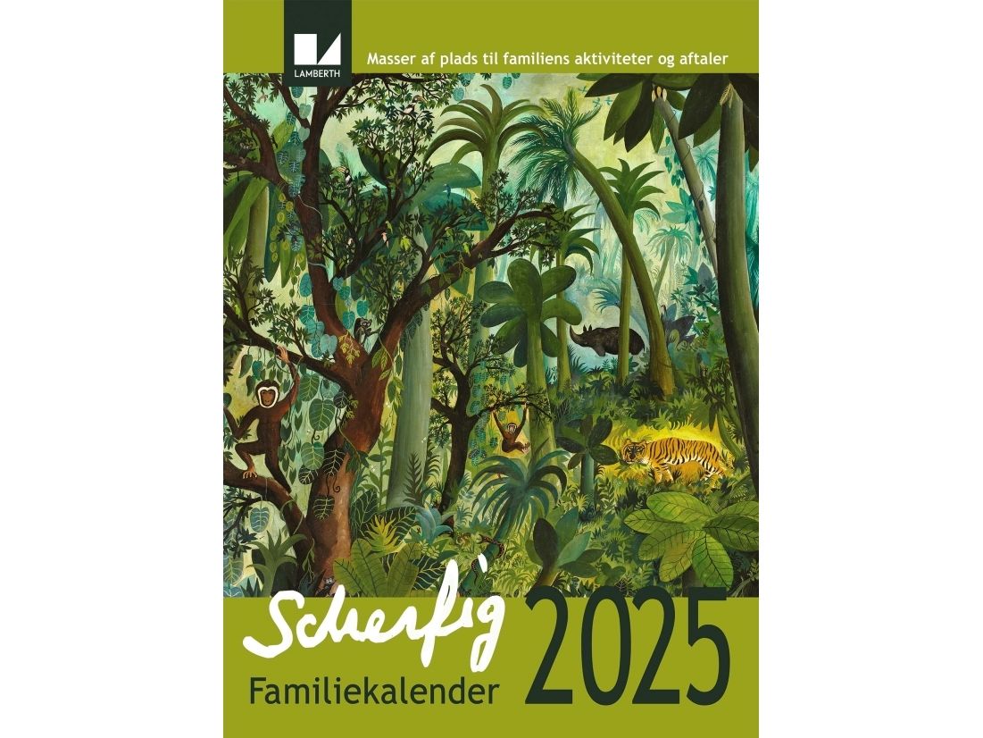 Familiekalender med masser af plads til familiens aktiviteter og aftaler, illustreret med Hans Scherfigs dejlige dyrebilleder.