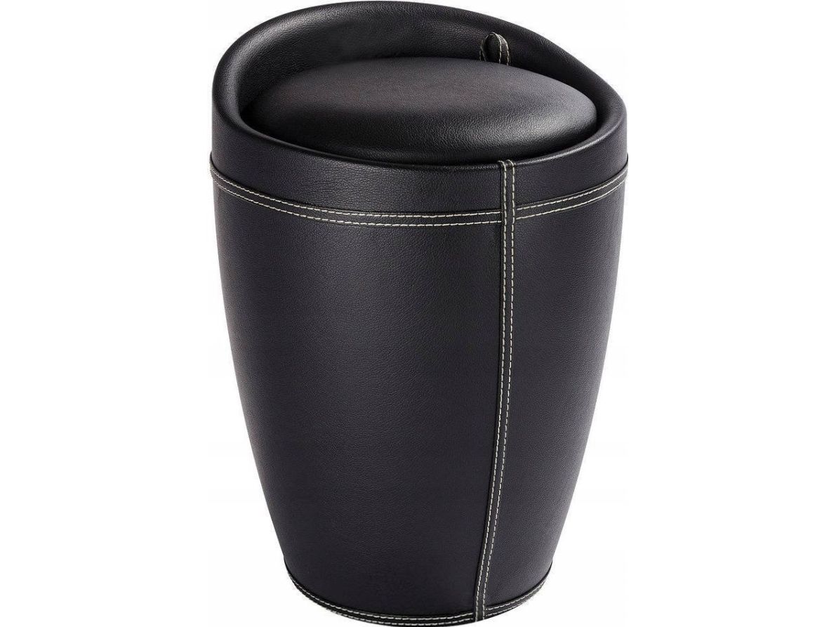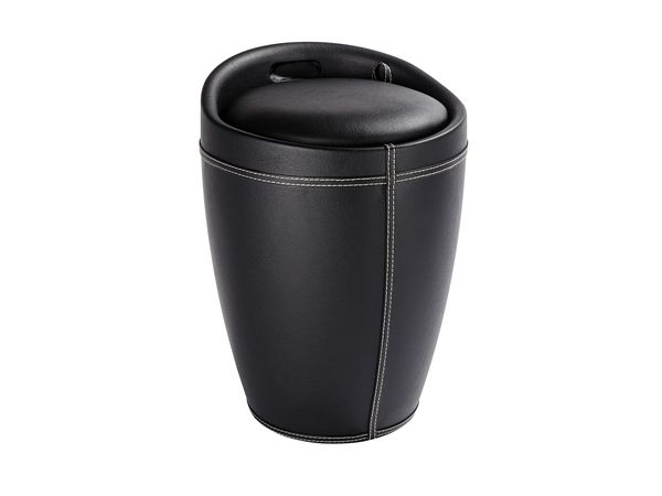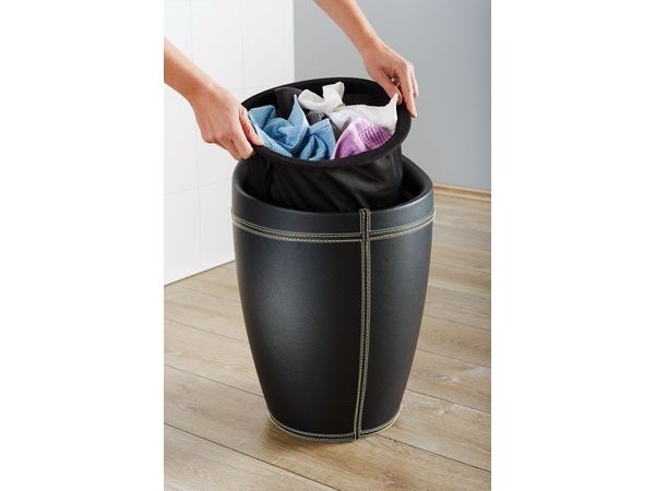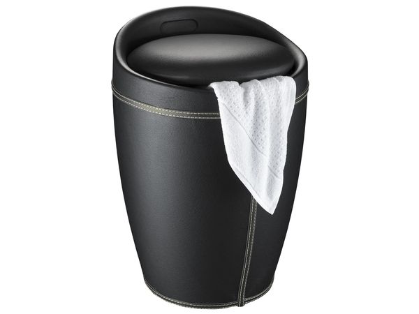 - Modern, round bathroom stool - Made of robust ABS plastic in a black leather look - Comfortable seat surface - With a removable laundry bag, content 20 litres - Dimensions (W/D x H): Ø 36 x 50,5 cm