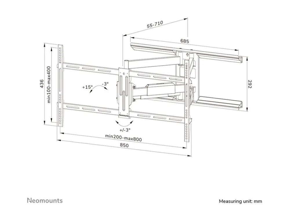 The Neomounts WL40-550BL18 is a full-motion wall mount for flat screens up to 75" with a maximum weight capacity of 45kg. The versatile tilt (18°) and swivel (54°) technology allows you to create the optimum viewing angle. The mount can be leveled for the perfect installation. The WL40-550BL18 has a depth of 5.5-71cm and is suitable for screens that meet VESA hole pattern 100x100 to 800x400mm. The mount features a nifty easy-release system that allows you to attach the TV in a wink of an eye. The mount is equipped with cable management, to secure any loose cables on the back of the screen.
