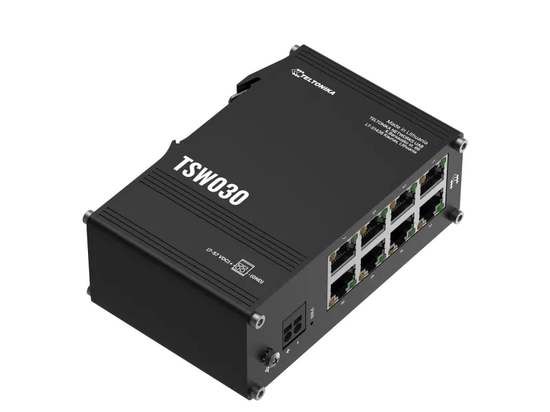 The Teltonika TSW030 is a reliable and efficient switch with a robust build that ensures optimal performance in various environmental conditions. With an operating temperature range of -40°C to 75°C and a humidity range of 5 - 95%, this product is suitable for both industrial and outdoor applications. The device features eight 10/100 Base-T ports and supports auto-uplink functionality, which simplifies connections and enhances network efficiency. Designed with user convenience in mind, the TSW030 boasts a packet buffer size of 128 KB and a non-blocking bandwidth of 20 Gbps, making it capable of handling high data loads without compromise. Its metal housing provides durability while maintaining compliance with various standards, such as IEEE 802.3u and IP30. The compact DIN rail mountable form factor ensures easy installation in diverse settings, making it a solid choice for any network setup.