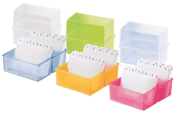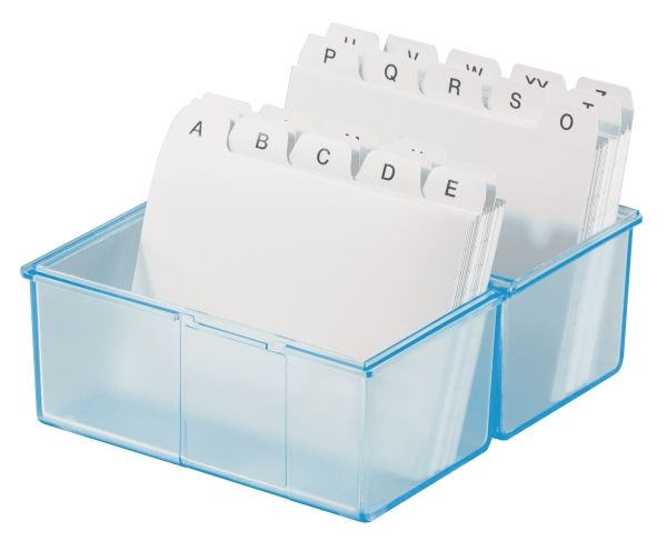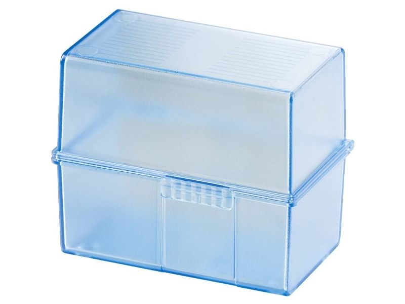 Kartotekskasse din A8 på tværs, til 200 kort. Inkl. A-Z register (best.-nr. 988) og 100 linjerede kartotekskort (best.-nr. 981). Den ideelle ordenshjælper på kontoret og på farten. Gennemsigtigt farver kombineret med højeste brug i moderne design. Udførelse i høj kvalitet med stålhængsel samt snaplukning. Låget kan klappes helt sammen og fungerer også som ekstra korttrug. Volumen 200 kort. Anvendelse til kortformat: Din A8 på tværs. Udvendige mål (B x D x H) 69 x 58 x 71 mm. Materiale: Plast af høj kvalitet, polystyrol (PS). Farve: Translucent-blå