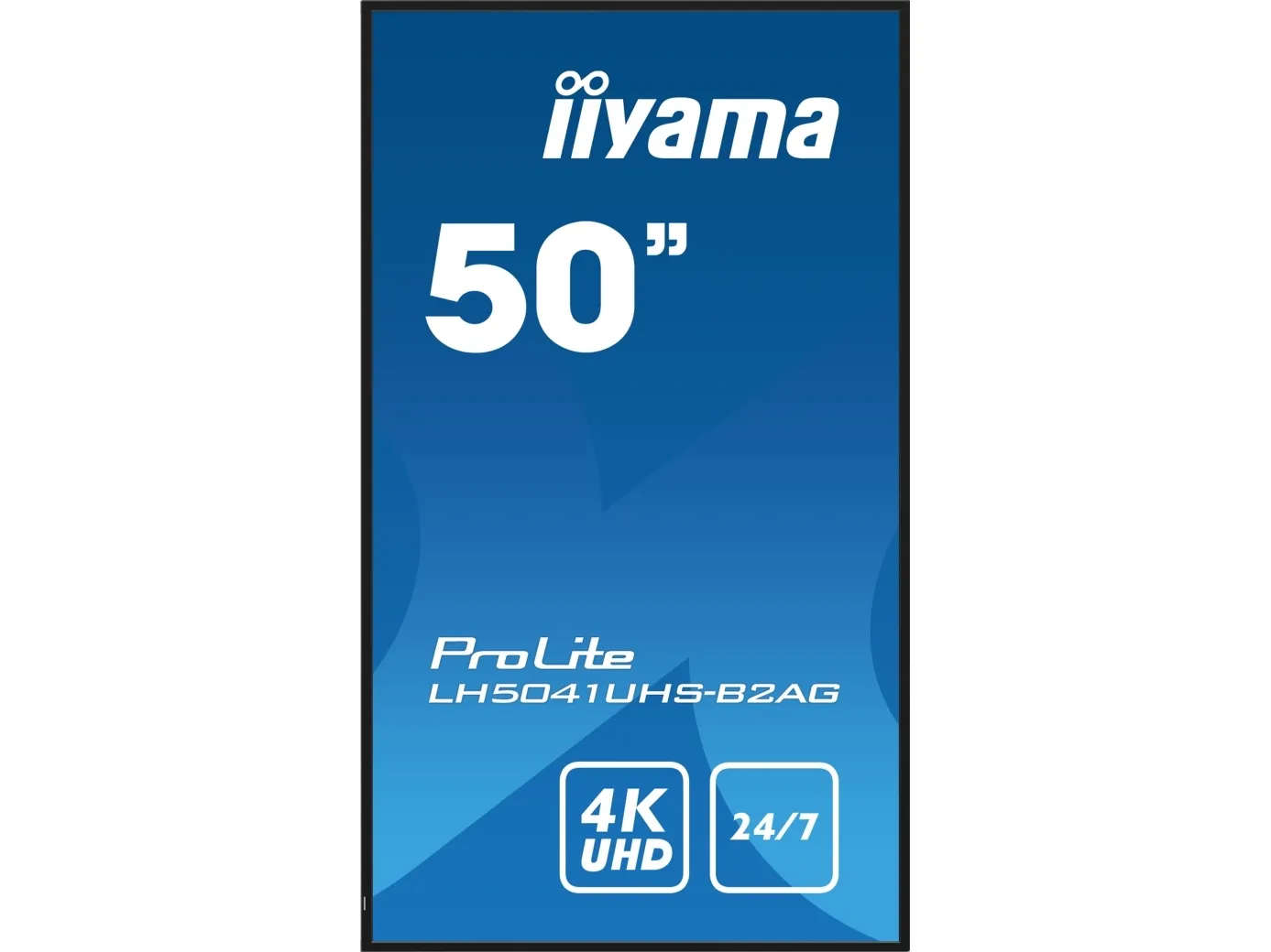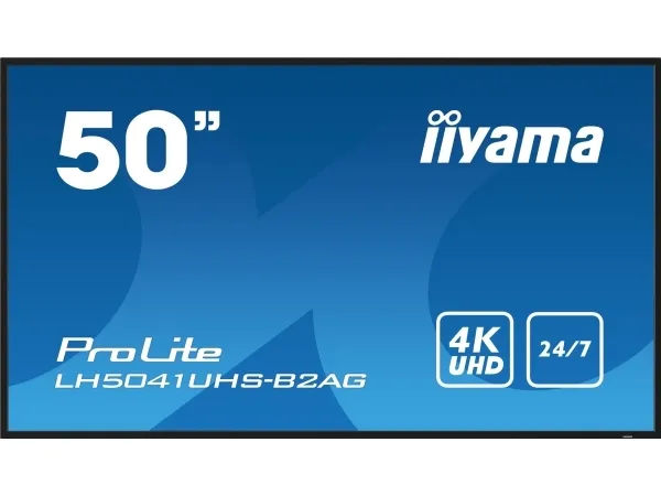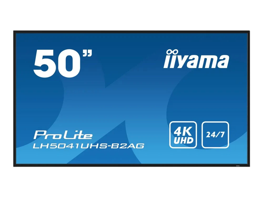Set in a slim bezel, the iiyama LH5041UHS is a professional digital signage display offering 24/7 operating time in portrait and landscape orientation. The 4K UHD resolution (3840x2160) provides exceptional colour and image performance. With the built-in media player you can play your favourite music and show your most beautiful videos, photos and images directly on screen.iiyama LH5041UHS-B2AG. Product design: Digital signage flat panel. Display diagonal: 127 cm (50"), Display technology: LCD, Display resolution: 3840 x 2160 pixels, Display brightness: 500 cd/m², HD type: 4K Ultra HD. Operating hours (hours/days): 24/7. Product colour: Black